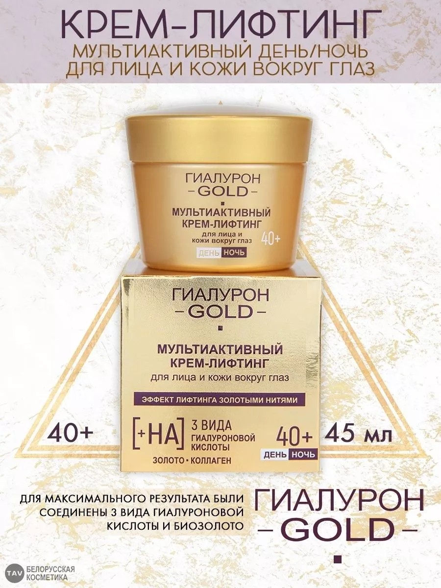 Мультиактивный крем-лифтинг создан с учетом особенностей и потребностей кожи в возрасте после 40 лет. Сверхсовременная богатая формула обеспечивает коже полноценный всесторонний уход 24 часа: глубокое увлажнение; питание и восстановление; замедление возрастных изменений в разных слоях эпидермиса, а также мощный и продолжительный эффект подтяжки, сравнимый с эффектом лифтинга золотыми нитями. Результат: при регулярном применении уменьшается количество, длина, глубина и ширина морщин; кожа становится увлажнённой, напитанной, ухоженной и подтянутой, сияет свежестью и красотой. Подходит для кожи любого типа. Рекомендуется использовать с 40 лет. Назначение: Лифтинг. Применение: нанесите утром и/или вечером на очищенную кожу лица и вокруг глаз.