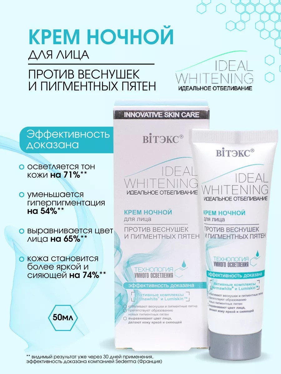 Anti-pigmentation cream from the Belarusian brand Vitex helps eliminate age spots and moisturize the skin. Now, to lighten dark age spots and freckles, simply apply the night whitening cream before bed. The night cream actively whitens freckles and age spots while you sleep, when the skin is at rest and most receptive to the active ingredients. While you sleep, the unique "smart" skin lightening technology of the Dermawhite and LumiskinTM complexes is actively at work: it identifies pigmented areas that need lightening and targets them. The cream helps reduce melanin synthesis, minimizes the appearance of age spots, and provides skin whitening. Natural bearberry extract enhances the whitening effect and moisturizes the skin.