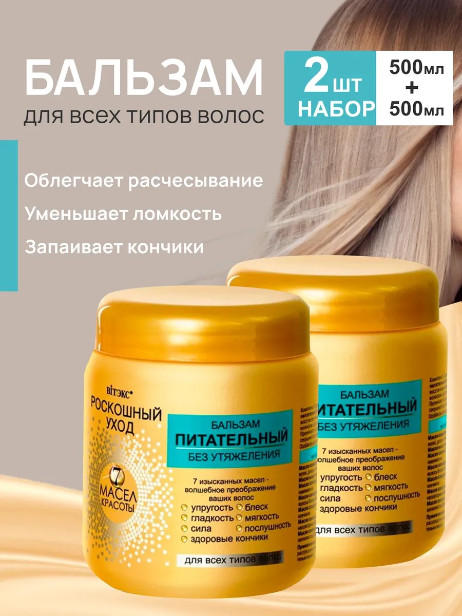 Для всех типов волос. Бальзам питательный 7 масел красоты роскошный уход обеспечивает глубокое питание и восстановление волос от корней до самых кончиков. Роскошный уход бальзам для волос дарит волосам шелковистую мягкость и ослепительный блеск. Бальзам питательный Витэкс проникает в кутикулу волоса, уменьшая ломкость, запаивает секущиеся кончики, улучшает расчесывание. Особая формула не утяжеляет волосы, оставляя их легкими.