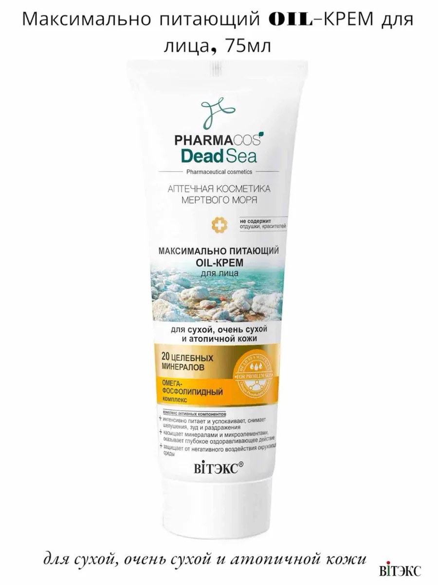 Крем для сухой и атопичной кожи oil pharmacos dead sea от Витэкс — это эффективное средство для ухода за чувствительной кожей. Формула крема, обогащенная минералами Мертвого моря, интенсивно увлажняет и питает кожу, снимая сухость, шелушение и зуд. Легкая текстура крема быстро впитывается, не оставляя жирной пленки, и подходит для ежедневного использования. Регулярное применение крема поможет восстановить защитный барьер кожи и вернуть ей мягкость и гладкость. Применение: наносите крем на очищенную кожу лица утром и вечером. Эффект усиливается при ежедневном применении.