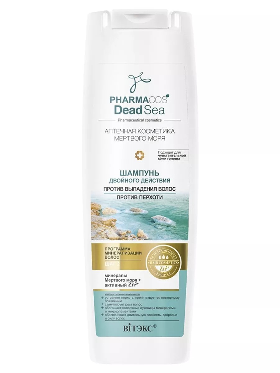 минералы Мертвого моря + активный Zn2+ - устраняет перхоть, препятствует ее повторному появлению; - стимулирует рост волос; - обогащает волосяные луковицы минералами и микроэлементами; - обеспечивает длительную свежесть, здоровье и силу волос. Шампунь двойного действия деликатно очищает волосы и, благодаря синергетическому действию целительной эссенции из 20 минералов Мертвого моря, запатентованного комплекса Dynagen и пиритионата цинка, эффективно помогает направленному решению двух проблем: перхоть и выпадение волос. 20 целебных минералов Мертвого моря (включая магний, кальций, серу, бромид, йод, натрий, цинк и калий) активно оздоравливают волосы и кожу головы, позволяя надолго избавиться от перхоти. Улучшают микроциркуляцию у корней волос, обеспечивают усиленное питание фолликулов, препятствуют выпадению волос и стимулируют их рост. Пиритионат цинка обладает выраженными противогрибковыми свойствами, благодаря чему эффективно борется перхотью, препятствует ее повторному появлению, снимает зуд и раздражение, нормализует работу сальных желез, надолго придает ощущение свежести и чистоты.