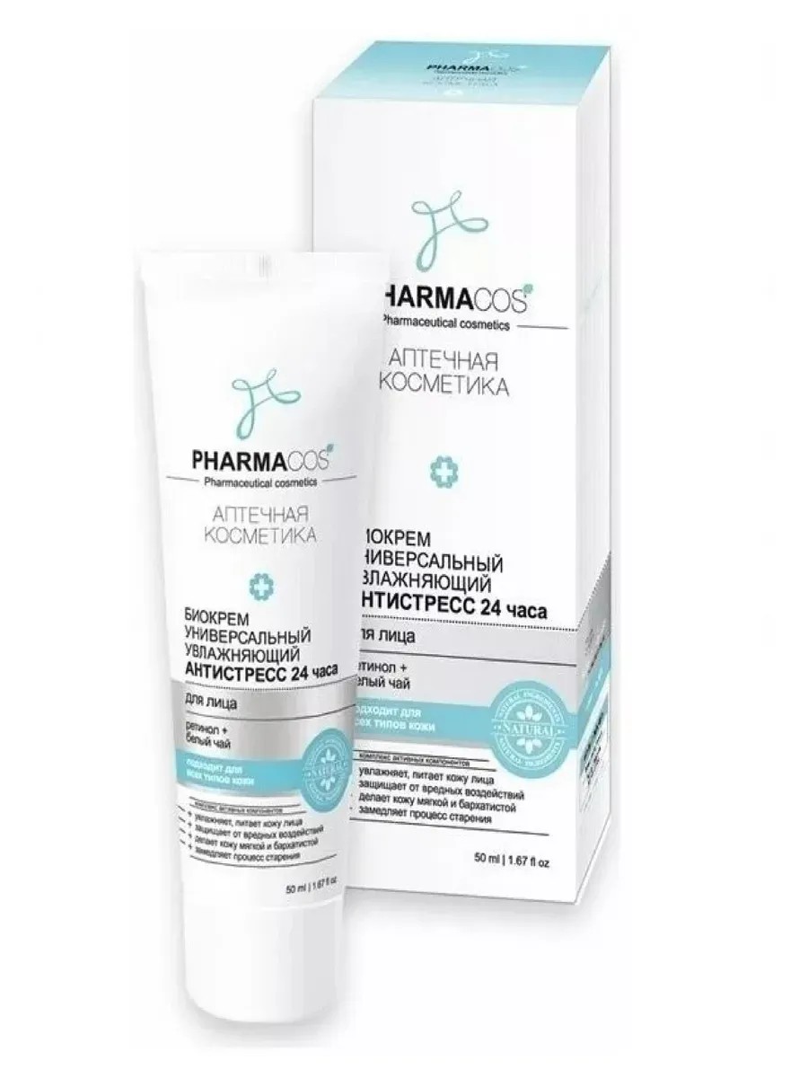 Витэкс, Крем для лица Pharmacos универсальный увлажняющий Антистресс 24 часа 50 мл, 1 шт. Благодаря уникальным активным компонентам биокрем бережно ухаживает за кожей, восполняет потерю влаги, делая кожу мягкой и бархатистой. Крем имеет легкую текстуру, равномерно распределяется по поверхности кожи и быстро впитывается, оставляя после себя комфортное ощущение мягкости и свежести на протяжении 24 часов. Ретинол помогает сохранить упругость кожи, стимулирует восстановление клеток кожи, сокращает мимические и глубокие морщины, улучшая цвет лица и выравнивая рельеф кожи. Инновационный комплекс U-Active SG на основе морского винограда, входящий в состав препарата, оказывает двойной эффект: он не только эффективно увлажняет, но и существенно сокращает морщины, замедляя процесс старения. Экстракт белого чая (Camemmia Simusis) активизирует процесс обновления, восстанавливает здоровый цвет лица, улучшая состояние кожи. Применение: наносите крем на чистую кожу лица, мягко массируйте до полного впитывания