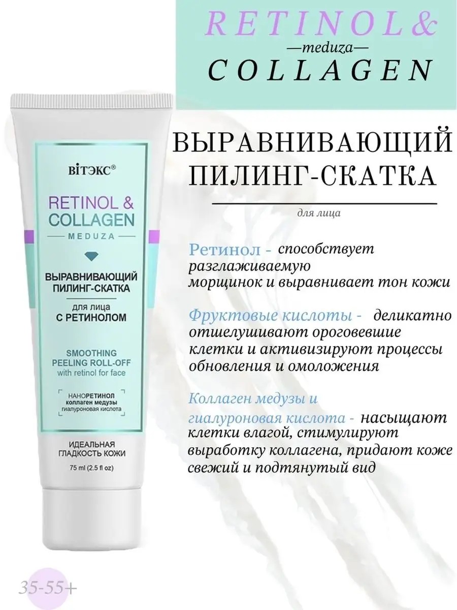 Smoothing facial peeling roll with retinol. PERFECTLY SMOOTH SKIN. This delightfully gentle peeling roll perfectly cleanses, polishes, and renews the skin, helping to preserve its youthful appearance. Its special peeling formula acts like an "eraser" for imperfections: upon application, it rolls off, cleansing and tightening pores, smoothing the skin, and improving complexion. A complex of fruit acids gently exfoliates dead skin cells and activates renewal and rejuvenation processes. Nanoretinol helps smooth wrinkles and even out skin tone. Jellyfish collagen and hyaluronic acid saturate cells with moisture, stimulate collagen production, and give skin a firm, fresh, and toned appearance. Epidermist transforms skin, tightens pores, and leaves the complexion fresh and radiant. Directions: Apply to damp skin, avoiding the eye area. Massage until clumping occurs. Rinse with water. Recommended use 2-3 times a week.