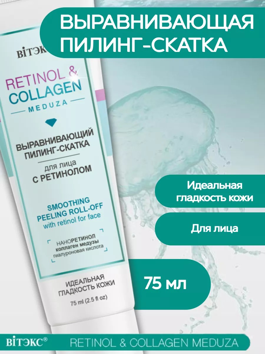 Vitex Retinol & Collagen Medusa Smoothing Facial Peeling with Retinol. This delightfully gentle peeling peeling perfectly cleanses, polishes, and renews the skin, helping to preserve its youthful appearance. Its special peeling formula acts like an eraser to erase imperfections: upon application, it rolls off, cleansing and tightening pores, smoothing the skin, and improving complexion. A complex of fruit acids gently exfoliates dead skin cells and activates renewal and rejuvenation processes. Nanoretinol helps smooth wrinkles and even out skin tone. Medusa collagen and hyaluronic acid saturate cells with moisture, stimulate collagen production, and give skin a firm, fresh, and toned appearance. Epidermist transforms skin, tightens pores, and leaves the complexion fresh and radiant. Directions: Apply to damp skin, avoiding the eye area. Massage until clumping occurs. Rinse with water. Recommended use 2-3 times a week.