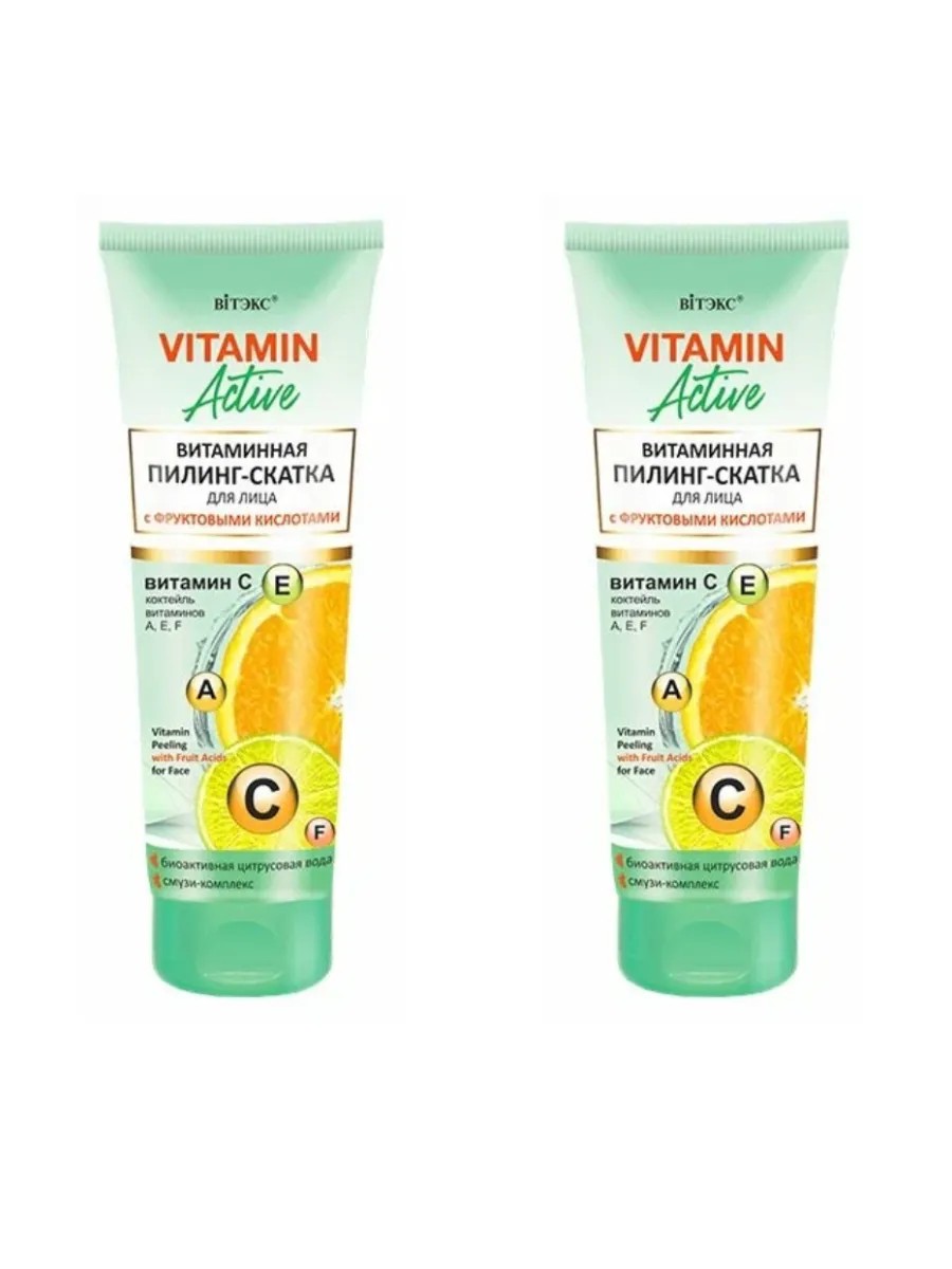 Vitex Vitamin Active Facial Peeling Gel with Fruit Acids, 75 ml, 2 pcs. Vitex Vitamin Active Facial Peeling Gel with Fruit Acids, 75 ml, has a light, non-greasy orange-colored texture. It gently rolls onto the skin and absorbs impurities, cleanses pores, and absorbs toxins, while simultaneously saturating the skin with essential vitamins and antioxidants. Directions: Apply to damp skin, avoiding the eye area, massage until clumps form, and rinse with water. Recommended use 2-3 times a week.