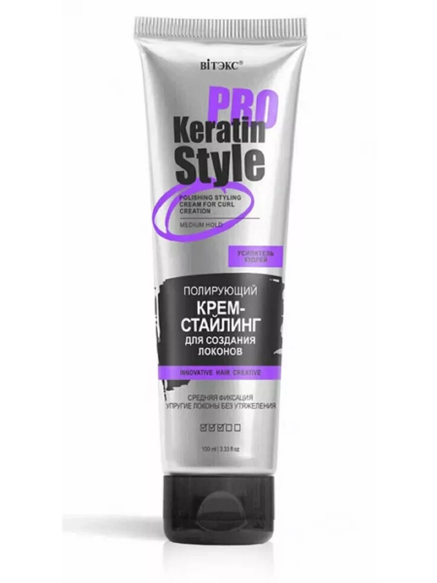 Vitex Keratin Pro Style Polishing Hair Styling Cream, 100 ml. This polishing curl-creating cream tames unruly curls, beautifully styles, and accentuates curls. Innovative Curl-Sculpting technology makes it easy to create elastic and bouncy curls, create a hairstyle with enticing curls, or highlight individual curls. Hair is frizz-free, and styles maintain a defined, beautiful shape even in high humidity. PROKeratin-complex HairProtect infuses hair with keratin, restoring its structure and adding healthy shine, elasticity, and strength. Style tips: For defined curls, use large curlers or a special comb. For seductive curls, create texture with your hands, squeezing and twisting the hair. Directions: Apply to damp hair and style.