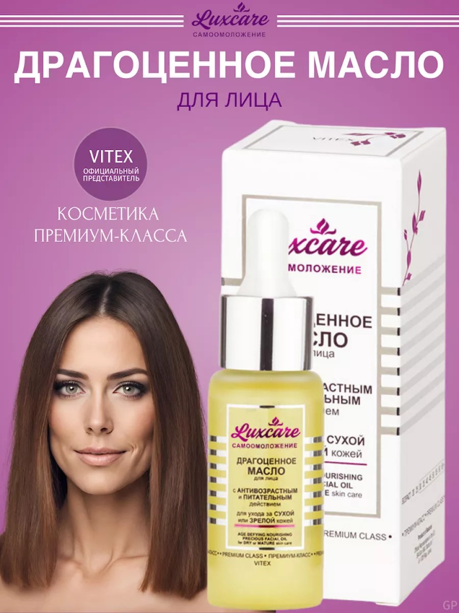 A precious facial oil with anti-aging and nourishing properties for dry or mature skin. LuxCare Vitex Premium Cosmetics. This precious oil has a highly regenerating effect. A nourishing complex of natural lipids and vitamins provides absolute comfort to the skin. The oil is instantly absorbed, leaving the skin smooth, soft, and velvety, without a greasy shine. Thanks to this precious oil, the skin is nourished and becomes smooth and soft, wrinkles are reduced, and the skin is filled with vitality and looks radiant. Active ingredients: jojoba oil, grape seed oil, hazelnut oil, and evening primrose essential oil. Directions: Apply a small amount of oil to clean skin and/or dry areas, and distribute evenly with light massage movements.