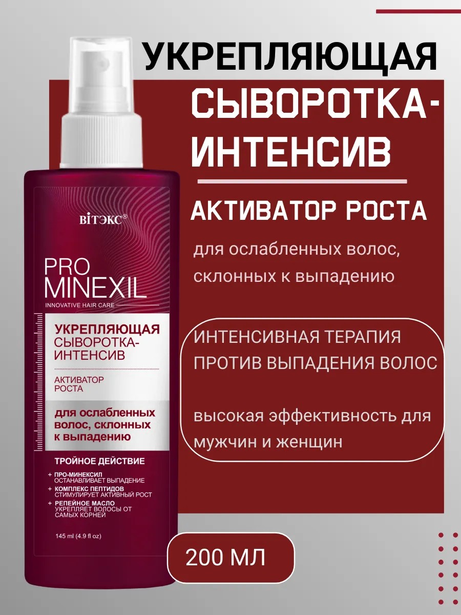 PRO MINEXIL УКРЕПЛЯЮЩАЯ СЫВОРОТКА-ИНТЕНСИВ — это инновационный активатор роста волос Витэкс, специально разработанный для борьбы с выпадением волос у мужчин и женщин. Эта интенсивная сыворотка сочетает в себе лучшие природные и научные компоненты, направленные на укрепление ослабленных волос и предотвращение их выпадения.
