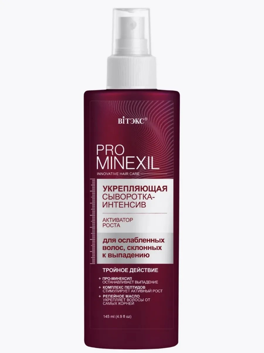 INTENSIVE HAIR LOSS THERAPY: Highly effective for men and women. Stress, fatigue, lack of sleep, environmental aggressors, and hormonal and metabolic imbalances can lead to increased hair loss. PRO-MINEXIL STOPS HAIR LOSS. PEPTIDE COMPLEX STIMULATES ACTIVE GROWTH. BURDOCK OIL STRENGTHENS HAIR FROM THE ROOT. This intensive serum is a concentrate of natural and scientifically proven hair growth activators that effectively reduce hair loss. Main active ingredients: PRO-MINEXIL (an effective alternative to minoxidil without withdrawal symptoms), peptide complex, burdock oil, cinnamon and rosemary oils, nicotinamide (vitamin B3), glycine, biotin Effective fight against alopecia (hair loss), increasing the number of hairs at the growth stage Rejuvenation of follicles, activation of the growth of strong, healthy hair Strengthening of hair follicles, saturating them with valuable nutrients Increased density and thickness of hair, prevention of thinning The serum does not weigh down or stick hair, does not leave marks.