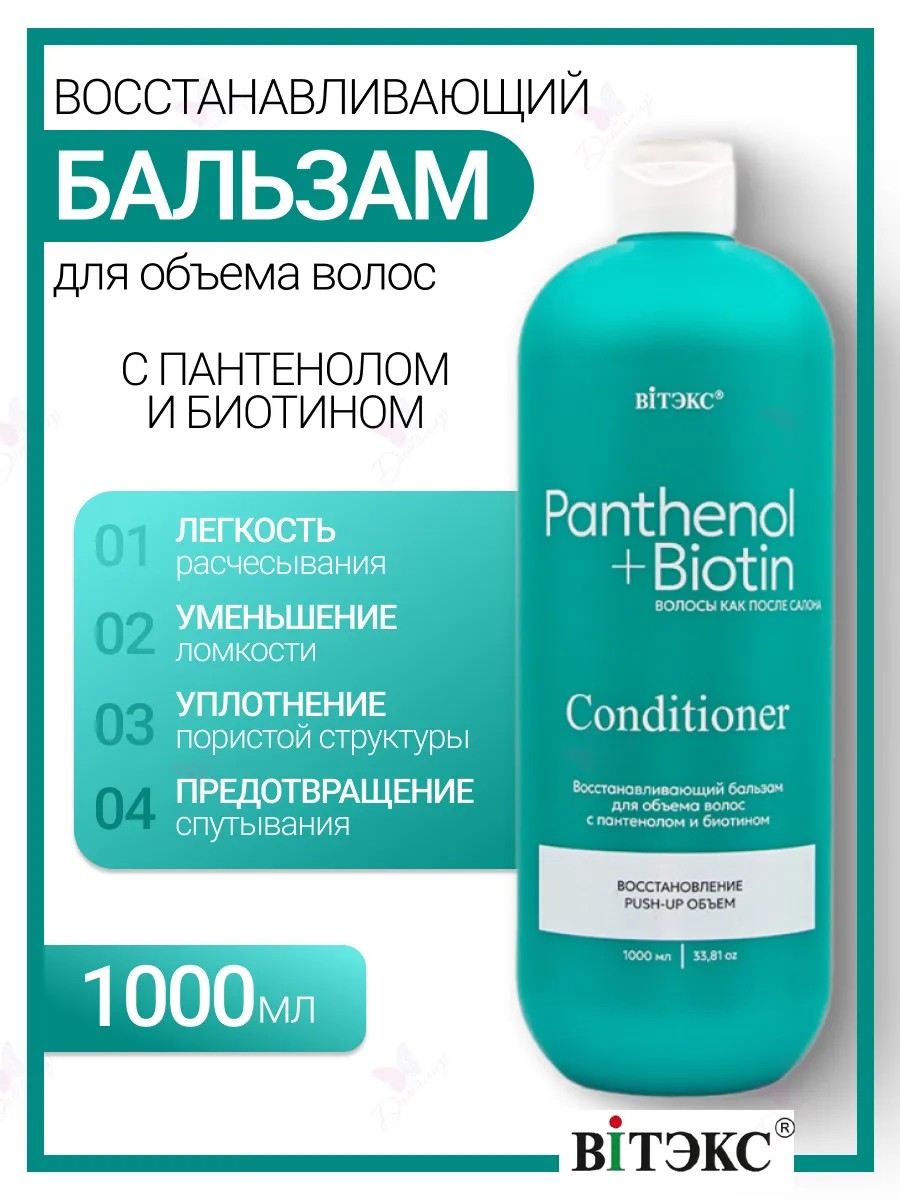 Panthenol+biotin Volumizing Conditioner with panthenol and biotin. Biotin - d-panthenol - is a conditioning complex. It restores and strengthens hair along its entire length, seals the pore structure, reduces breakage, makes combing easier, and prevents tangling without weighing it down. This restorative balm helps transform damaged, weakened, and volume-depleted hair in just minutes. D-panthenol restores and strengthens hair, increases its thickness and density, adds lush volume, provides long-lasting deep hydration, reduces split ends, and gives locks a mirror-like shine. Biotin eliminates dryness and improves scalp condition, visibly reduces hair breakage, makes hair stronger and more resilient, and adds volume. This conditioning complex disciplines unruly hair, eliminates frizz, thickens, makes combing easier, and leaves locks silky smooth and glossy. Application: apply to washed hair, rinse with water after 1-2 minutes.