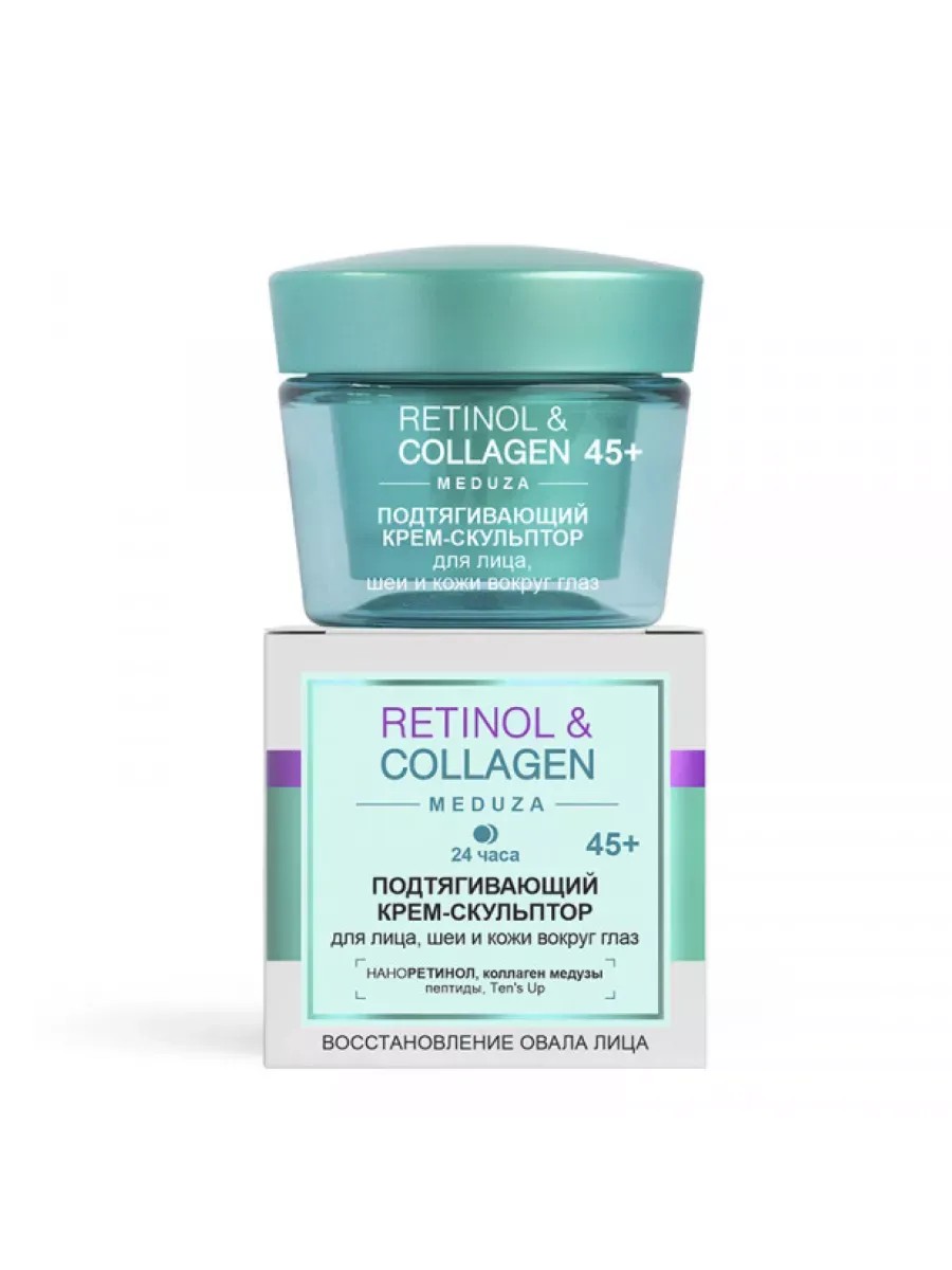 Крем-скульптор Retinol&Collagen meduza Подтягивающий Для лица, шеи и кожи вокруг глаз 45+, 45 мл. Восстановление овала лица. Роскошная формула крема объединила в себе «звездные» омолаживающие и подтягивающие компоненты, которые запускают процессы регенерации кожи и восстановления овала лица. Наноретинол стимулирует обновление клеток, повышает упругость кожи, сокращает морщины и улучшает цвет лица. Коллаген медузы восполняет недостаток собственного коллагена, укрепляет овал лица, делает кожу более упругой и плотной, разглаживает морщины. Комплекс из 4-х пептидов
