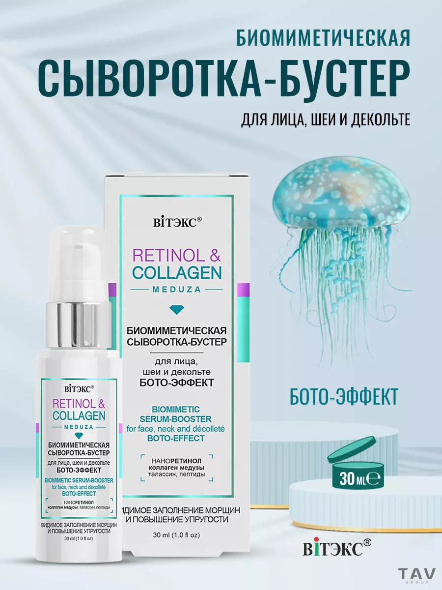 Biomimetic BOTO-EFFECT SERUM for face, neck, and décolleté. VISIBLE WRINKLE FILLING AND INCREASED ELASTICITY. A unique beauty product with a BOTO-effect – an alternative to "beauty injections." The serum formula is based on "star" rejuvenating ingredients that promote active rejuvenation and tightening of the skin, smoothing and "freezing" wrinkles. Jellyfish collagen replenishes the skin's own collagen, strengthens its structure, and reduces the number and depth of wrinkles. An innovative complex of 6 peptides has a proven rejuvenating and moisturizing effect. Visibly tightens facial contours, leaving skin smooth and silky. Directions: Apply morning and/or evening to cleansed skin.