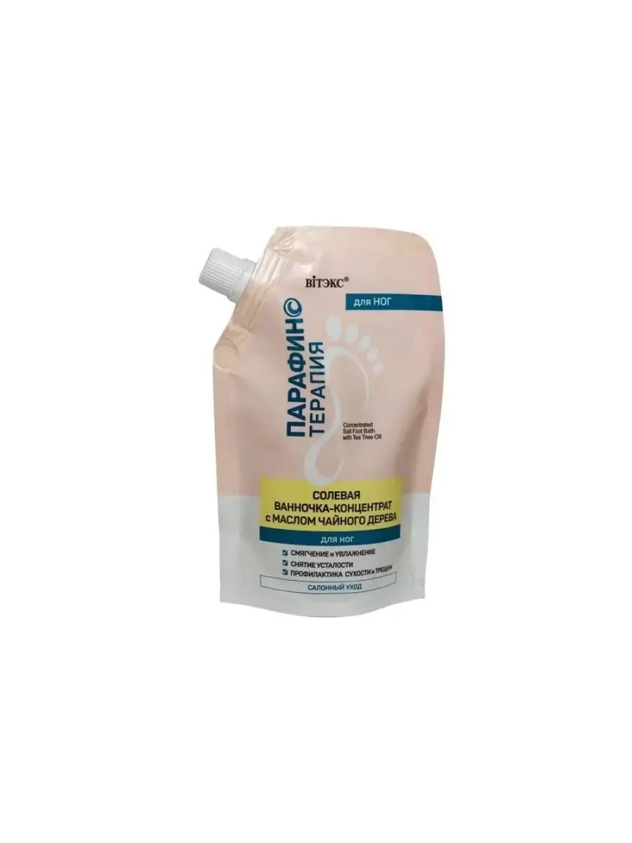 Vitex Salt Foot Bath Concentrate with Tea Tree Oil Paraffin Therapy, 170 ml. Tea tree oil has an antibacterial effect, tones, accelerates the healing of microcracks, and helps reduce sweating. Liquid paraffin is a highly effective ingredient used in professional beauty salons for foot care. Thanks to its unique properties, it provides quick, visible results to restore the skin's long-lasting smoothness, softness, and well-groomed appearance. Liquid paraffin creates a weightless, occlusive, breathable film that prevents dryness, keeping the skin moisturized, nourished, soft, and supple for a long time.