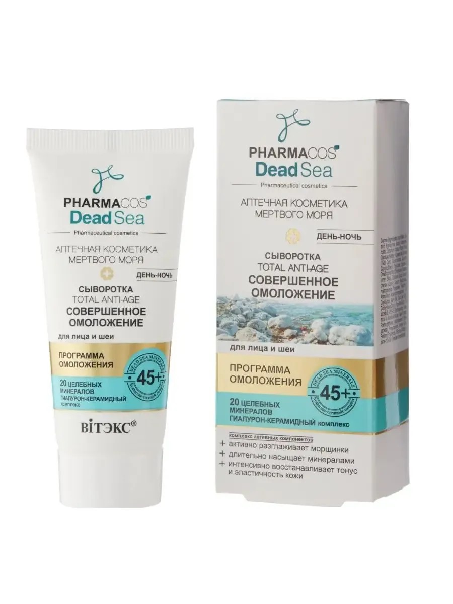 Vitex Pharmacos Dead Sea Total Anti-Age Serum 45+ Perfect Day-Night Rejuvenation for Face and Neck, 30 ml. This rich serum formula, with deep penetration technology, provides a comprehensive anti-aging effect tailored to the individual skin needs: hydration, nourishment, wrinkle smoothing, facial contour correction, improved skin tone, firmness, and elasticity, and pigmentation lightening. Directions: After cleansing and toning, apply the serum to the face and neck before applying cream morning and/or evening.