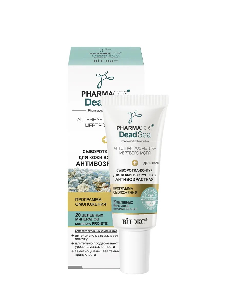 VITEX PHARMACOS DEAD SEA ANTI-AGING DAY-NIGHT CONTOUR SERUM FOR THE EYE AREA 20ML, 20 HEALING MINERALS, PRO-EYE COMPLEX: Intensively smoothes fine lines, maintains long-lasting moisture levels, visibly reduces dark circles and puffiness. REJUVENATION PROGRAM. This contour serum, with its unique deep dermal delivery technology, effectively corrects signs of aging and counteracts age-related changes. A healing elixir of 20 Dead Sea minerals replenishes essential cellular nutrients, stimulates skin renewal, strengthens its structure, and maintains moisture levels.