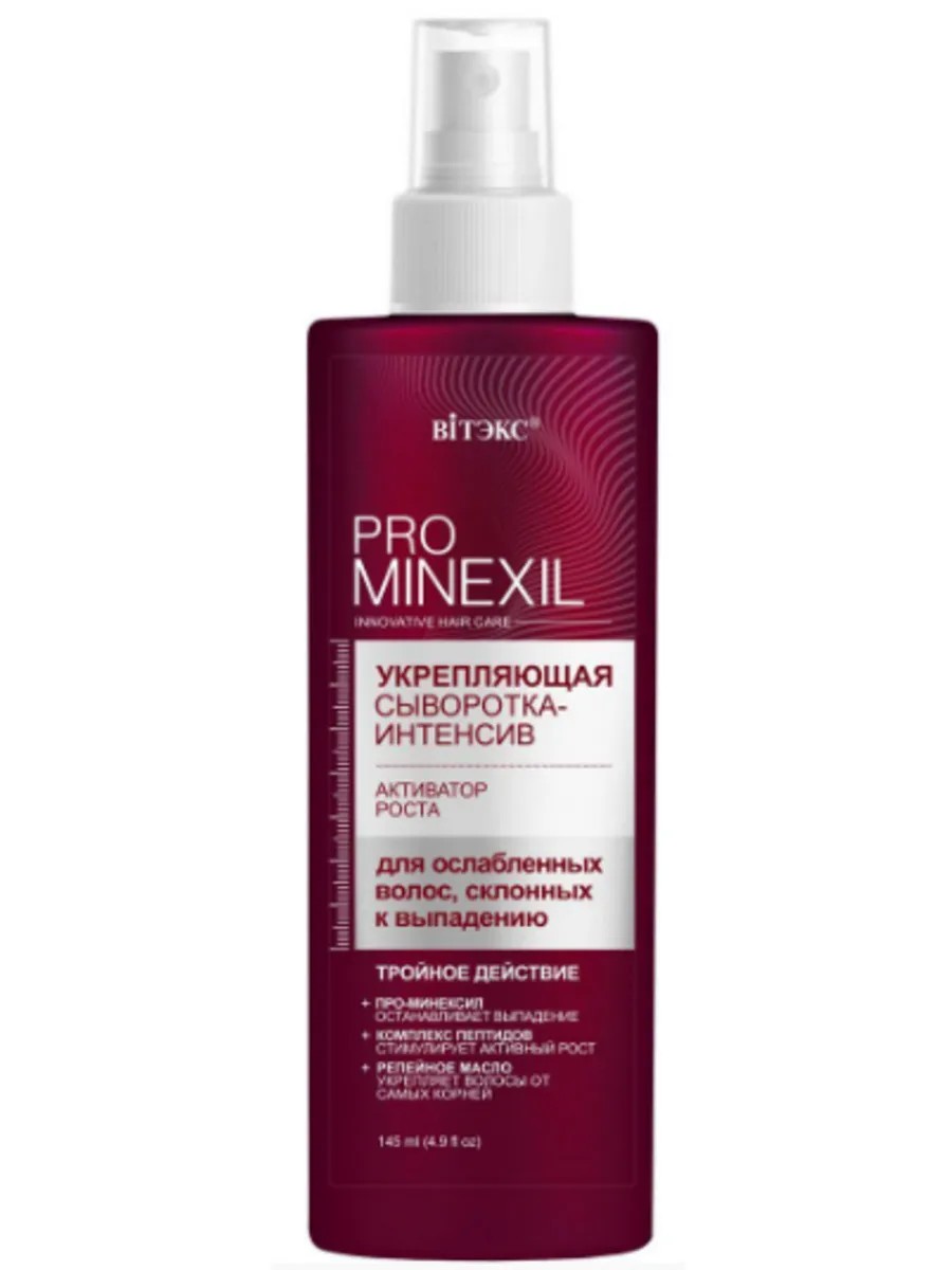 Вiтэкс, Укрепляющая сыворотка-интенсив Активатор роста для ослабленных волос, склонных к выпадению PRO Minexil 145 мл., 1 шт. Интенсивная сыворотка – это концентрат природных и высоконаучных компонентов-активаторов роста волос, которые эффективно уменьшают выпадение. ПРО-МИНЕКСИЛ (эффективная альтернатива миноксидилу без синдрома отмены), комплекс пептидов, репейное масло, масла корицы и розмарина, никотинамид (витамин B3), глицин, биотин