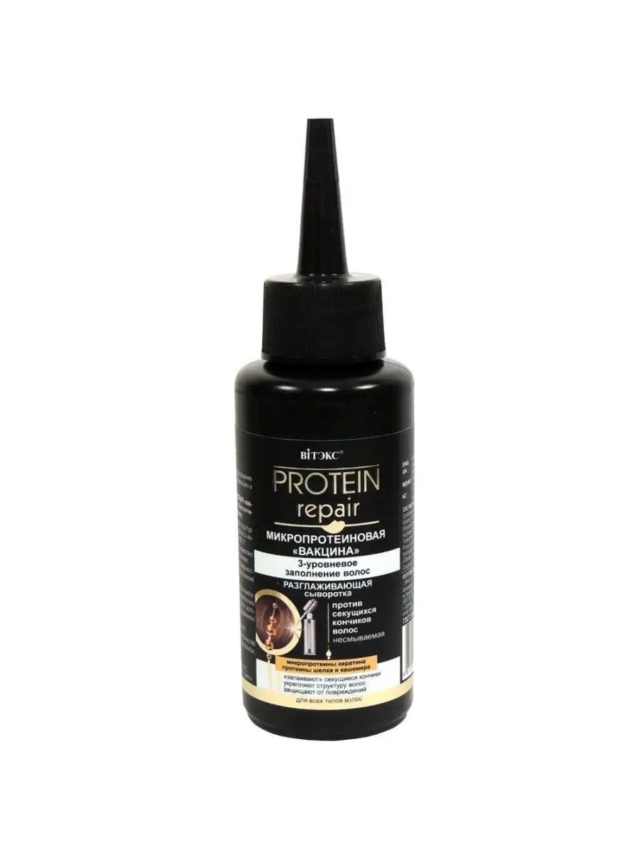 ВИТЭКС PROTEIN REPAIR СЫВОРОТКА Разглаживающая для секущих кончиков волос Несмываемая 80 мл.Кончики волос наиболее подвержены разрушающему воздействию негативных факторов (использование термоприборов (фен, щипцы и т.д.), воздействие УФ-лучей и жесткой воды, и др.) на волосы, поэтому им требуется более тщательный уход, чем остальной части волоса. Разглаживающая сыворотка создана для решения проблемы секущихся кончиков, их реставрации и защиты от повреждений. МИКРОПРОТЕИНОВАЯ вакцина восстанавливает и укрепляет кутикулу волос, запаивает секущиеся кончики. Сыворотка начинает работать на поверхности волос сразу после нанесения и уже через несколько минут можно наблюдать ее волшебную силу: волосы становятся более гладкие, упругие и эластичные, кончики запаиваются.
