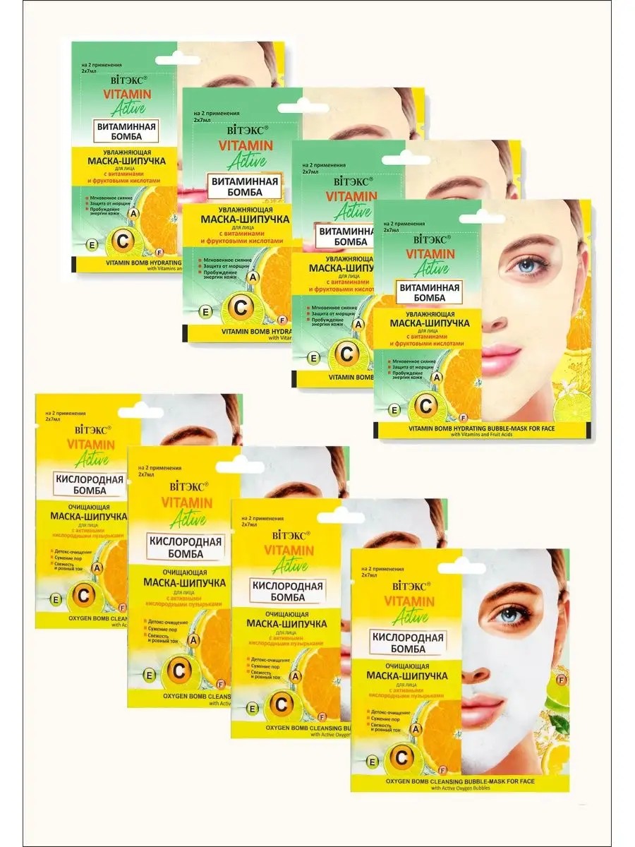 Набор косметических масок для лица: Маска для лица Кислородная бомба 4 шт. + Маска шипучка Витаминная бомба 4 шт. VITAMIN ACTIVE. Попробуй восхитительный пузырьковый микромассаж активными кислородными пузырьками вместе с очищающей маской-шипучкой. Прозрачная шелковистая текстура сочно-зеленого цвета легко и гладко распределяется по коже, превращаясь в пушистую пену, которая эффективно очищает кожу от загрязнений и токсинов, при этом насыщает ее кислородом и витаминами. Подари своей коже потрясающий микромассаж восхитительными кислородными пузырьками вместе с увлажняющей маской-шипучкой. Похожая на вкусное апельсиновое желе, свежая и прозрачная, маска легко распределяется по коже, превращаясь в воздушную пену, которая глубоко очищает кожу от загрязнений и токсинов, при этом насыщает ее кислородом и полезными веществами. Применение: нанесите на очищенную влажную кожу, избегая области вокруг глаз, через 7-10 минут смойте теплой водой. Используйте 1-2 раза в неделю.