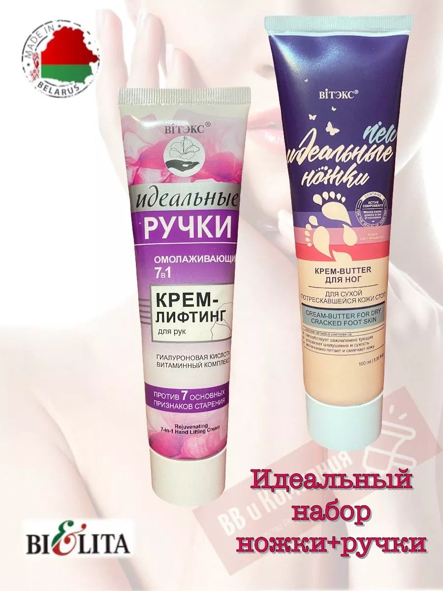A set of creams from the "Perfect Hands" series. In winter, the skin of your hands becomes dry and cracked. Just one application of this rich, nourishing butter cream for hands and nails from the Belarusian brand Vitex will provide long-lasting hydration. This beauty product deeply nourishes dry and very dry skin, providing intensive care for cuticles and brittle nails. This effect is achieved thanks to the presence of four oils. Crambe butter makes the skin soft and supple, thanks to its abundant fatty acids. Shea butter moisturizes and protects the epidermis from adverse environmental factors. Coconut oil creates a protective film on the skin's surface, further nourishing and softening the skin. Almond oil and keratin help strengthen nails, prevent splitting and brittleness, and regulate lipid and water balance. Treat yourself to the effective and beautiful care from Vitex! Directions for use: Apply the cream to clean skin of your hands with light massaging movements.