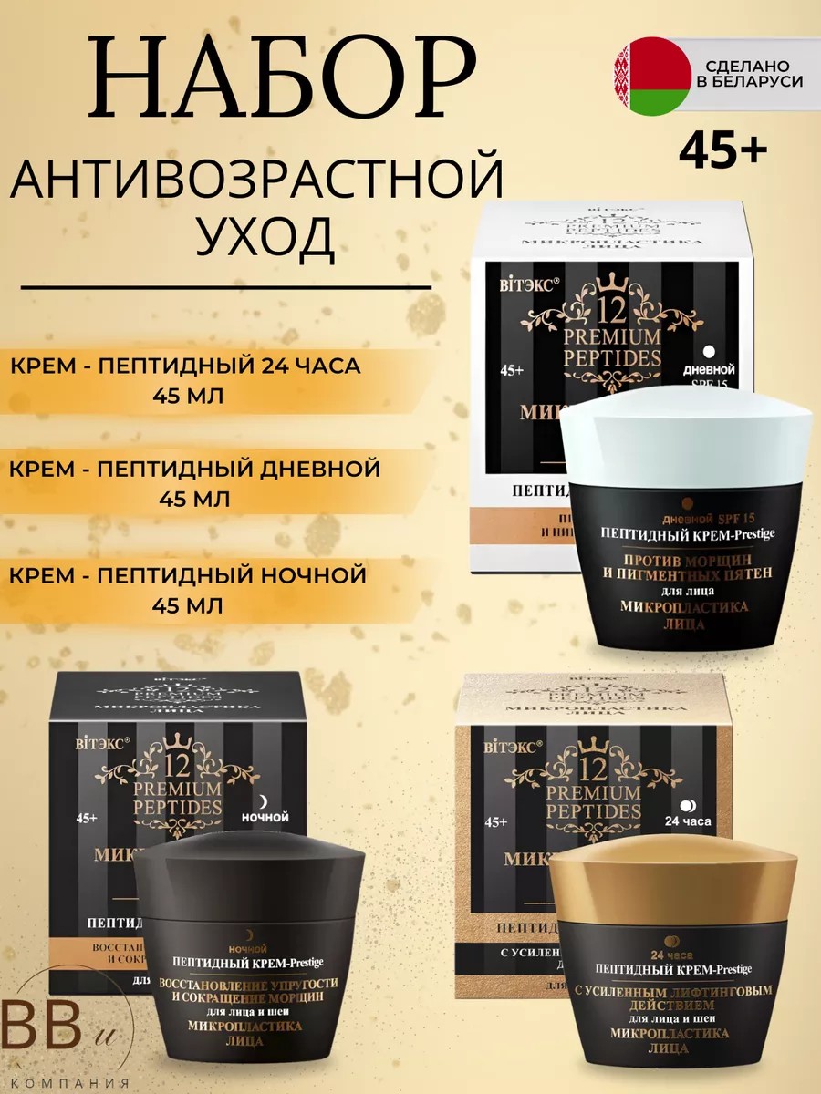 Крем для лица. В набор входят следующие крема пептидный крем для лица и шеи Prestige Микропластика (дневной), пептидный крем восстановление упругости и сокращение морщин (ночной), пептидный крем с усиленным лифтинг действием (24).