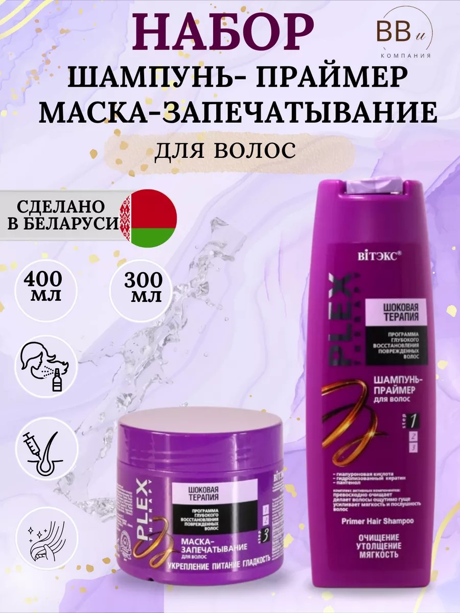 Набор Шампунь, бальзам для волос "Шоковая терапия" Plex Therapy/ Активные компоненты придают волосам удивительную мягкость и гладкость, создавая эффект струящегося шелка. Даже поврежденные волосы наполняются силой, становятся более плотными, прочными и послушными.Шампунь-праймер это первый этап программы PLEX THERAPY. Специальная формула шампуня усиливает эффективность сыворотки и маски линии PLEX THERAPY Шоковая терапия, способствуя проникновению активных компонентов в самые глубокие слои волоса. Комплекс активных компонентов данного продукта: превосходно очищает, делает волосы ощутимо гуще, усиливает мягкость и послушность волос. Основные компоненты: гиалуроновая кислота, гидролизованный кератин, пантенол. Гиалуроновая кислота глубоко увлажняет, придает волосам мягкость, упругость, эластичность и гладкость. Гидролизованный кератин восстанавливает поврежденные участки, утолщает структуру волос, увеличивает прочность и уменьшает ломкость волос.
