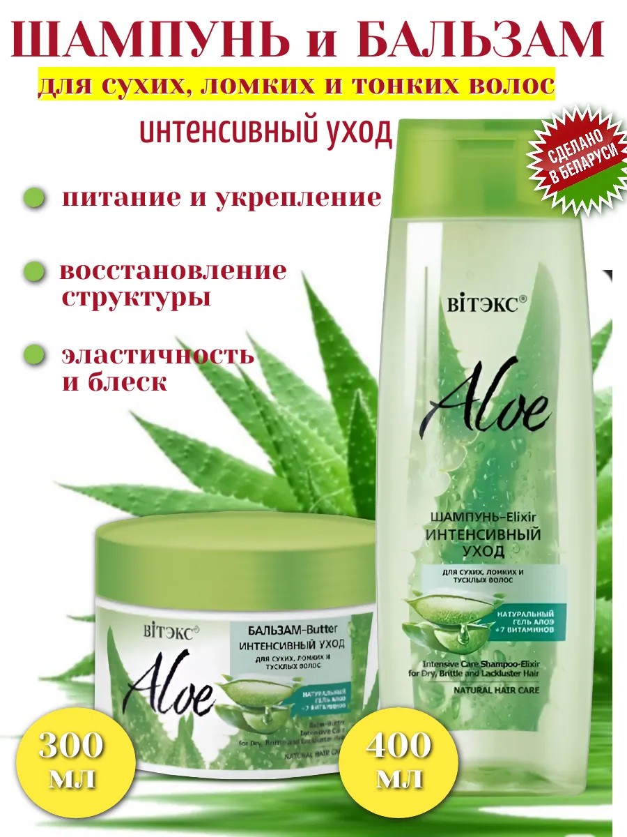 1.Шампунь-Elixir Витэкс Aloe+7 Витаминов Интенсивный уход 400 мл. - питание и увлажнение восстановление структуры, жизненная сила и блеск и максимально натуральная прозрачная формула органично соединяет эффективные очищающие свойства шампуня и глубокое действие увлажняющего эликсира, чтобы одновременно подарить идеальную чистоту и интенсивный уход волосам, склонным к сухости, ломкости и тусклости. Результат: необыкновенно увлажненные, эластичные, сильные и блестящие волосы от корней до кончиков.
