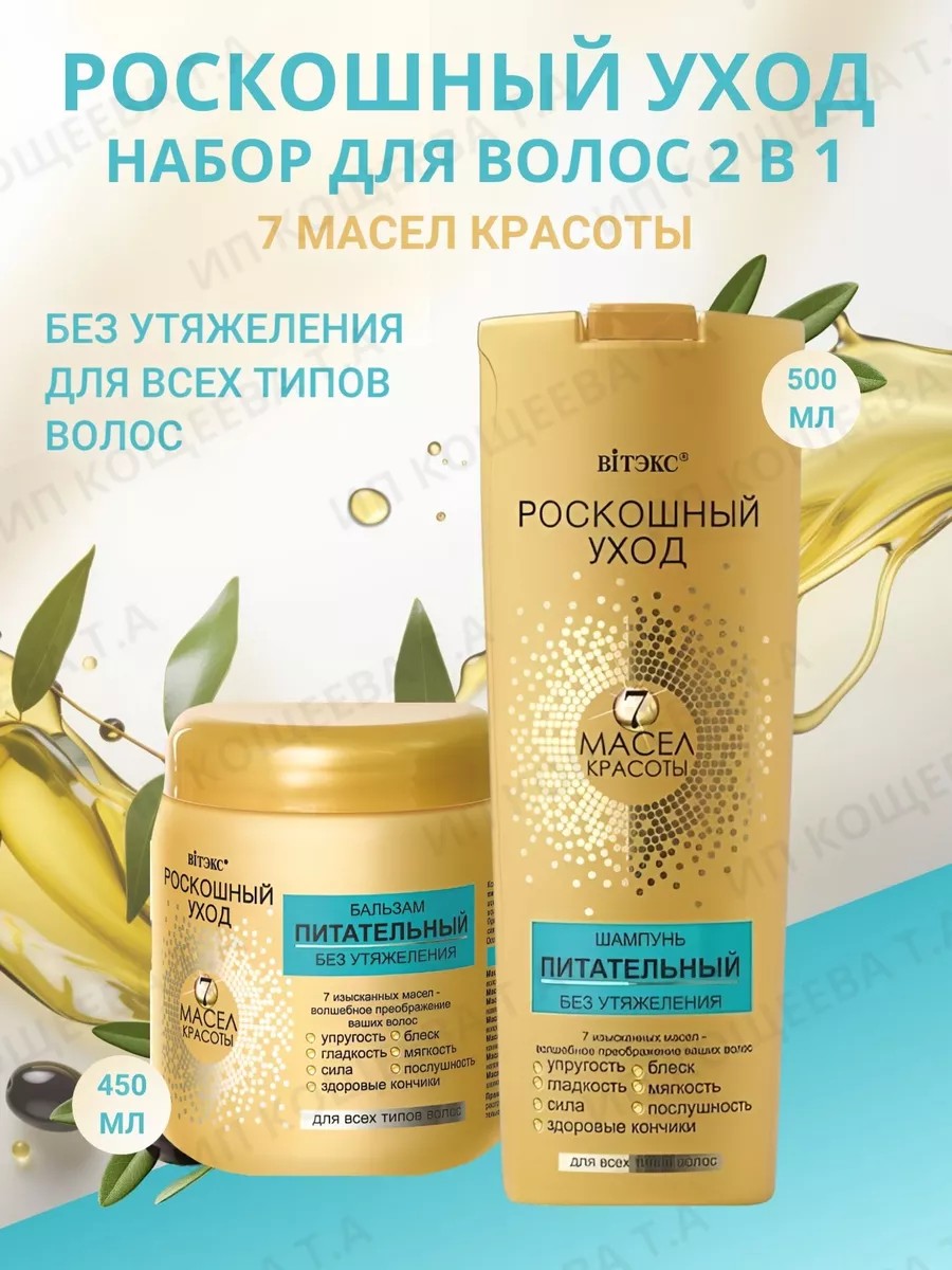 Набор по уходу за волосами Роскошный уход - 7 масел красоты Витэкс. Шампунь питательный без утяжеления для всех типов волос 500 мл и Бальзам питательный без утяжеления для всех типов волос 450 мл.. Мягко и бережно очищает, питает и восстанавливает волосы по всей длине, предотвращая появление секущихся кончиков, уменьшает ломкость волос. Придает им невероятный ослепительный блеск, зеркальную гладкость, мягкость и шелковистость. В комплексе линии "7 масел красоты" шампунь оказывает эффективное воздействие на волосы, придавая им по-настоящему роскошный вид. Обеспечивает глубокое питание и восстановление волос от корней до самых кончиков. Дарит волосам шелковистую мягкость и ослепительный блеск. Проникает в кутикулу волоса, уменьшая ломкость, запаивает секущиеся кончики, улучшает расчесывание. Бальзам проникает в кутикулу волоса, уменьшая ломкость, запаивает секущиеся кончики, улучшает расчесывание. БЕЗ УТЯЖЕЛЕНИЯ.