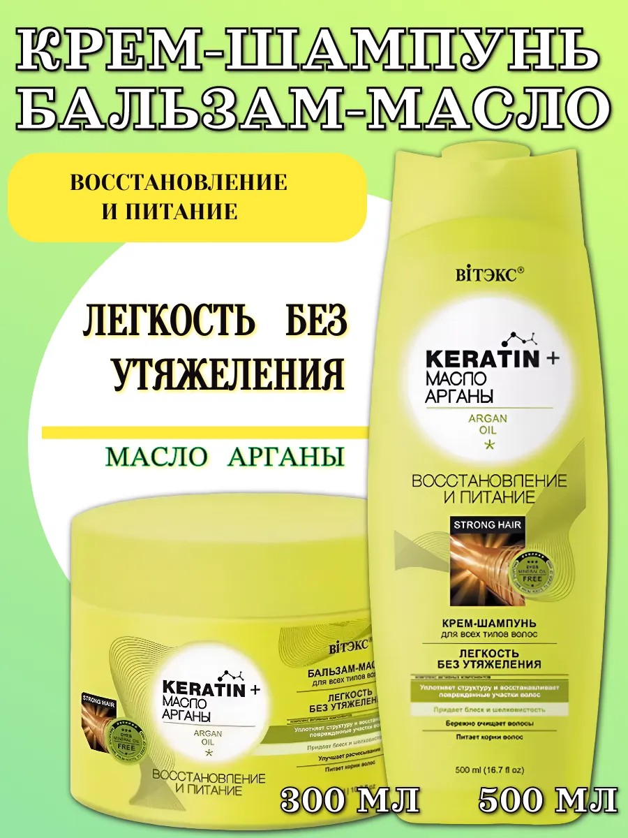 1.Шампунь Витэкс Keratin&Масло Арганы Восстановление и питание 500 мл. - бережно очищает волосы, глубоко питает, уплотняет структуру волос и восстанавливает поврежденные участки, придает волосам здоровый блеск и шелковистость, не утяжеляя их. Легкость без утяжеления!