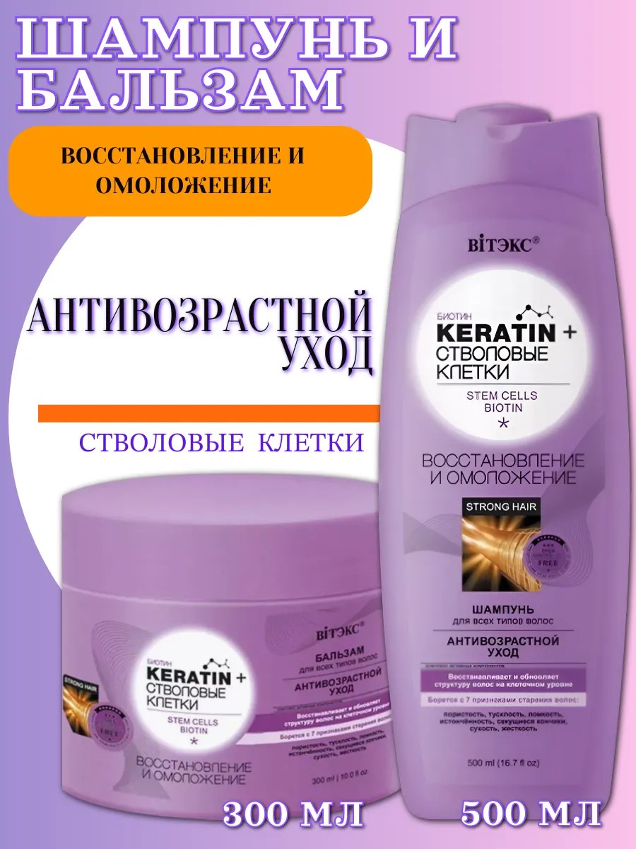 Шампунь Витэкс Keratin&Стволовые клетки восстановление и омоложение 500 мл. - нежно очищает, питает и укрепляет волосы, способствуя восстановлению и обновлению их структуры на клеточном уровне. Борется с 7 признаками старения волос: пористость, тусклость, ломкость, истонченность, секущиеся кончики, сухость.
