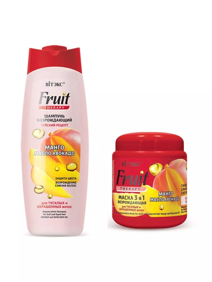 Набор косметики для волос линия Fruit Therapy. Белорусская косметика Белита- Витекс.МАСКА 3 в 1 ВОЗРОЖДАЮЩАЯ для тусклых и окрашенных волос «Манго, масло авокадо». Уникальная возрождающая формула, вдохновлённая традиционными тайскими рецептами красоты, – это настоящее спасение для окрашенных волос и волос, склонных к тусклости. Свежайший сок спелого манго, ценное масло авокадо в сочетании с инновационными эффективными ухаживающими комплексами увлажняют и питают волосы, обеспечивают защиту от неблагоприятного воздействия факторов окружающей среды, придают шелковистую мягкость и здоровый блеск. Волосы наполняются искрящимся сиянием и сохраняют яркость цвета до 10 недель.Блистательный результат: роскошный яркий цвет здоровых блестящих волос.ШАМПУНЬ ВОЗРОЖДАЮЩИЙ для тусклых и окрашенных волос «Манго, масло авокадо». Уникальная формула шампуня разработана на основе традиционного тайского рецепта специально для тусклых и окрашенных волос и дарит им возрождающую силу тайских фруктов в сочетании с превосходным очищением.Свежайший сок спелого манго, ценное масло авокадо и эффективные ухаживающие комплексы питают, увлажняют и восстанавливают волосы по всей длине, возрождая их сияние и красоту, придают волосам мягкость, гладкость и шелковистость, защищают от негативного воздействия внешних факторов, помогают сохранить яркость цвета до 10 недель. Блистательный результат: роскошный яркий цвет здоровых блестящих волос.