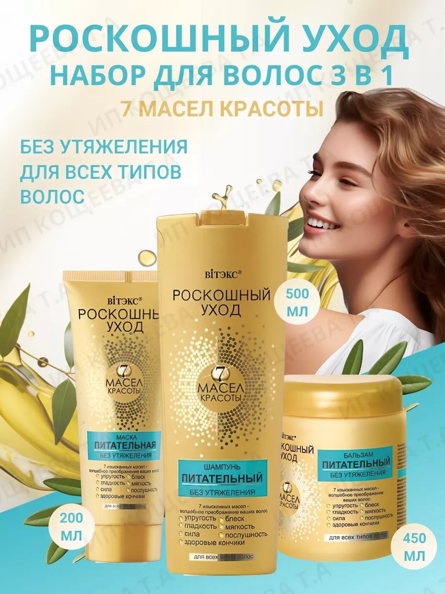 Набор по уходу за волосами Роскошный уход - 7 масел красоты Витэкс. Мягко и бережно очищает, питает и восстанавливает волосы по всей длине, предотвращая появление секущихся кончиков, уменьшает ломкость волос. Придает им невероятный ослепительный блеск, зеркальную гладкость, мягкость и шелковистость. В комплексе линии "7 масел красоты" шампунь оказывает эффективное воздействие на волосы, придавая им по-настоящему роскошный вид. Обеспечивает глубокое питание и восстановление волос от корней до самых кончиков. Дарит волосам шелковистую мягкость и ослепительный блеск. Проникает в кутикулу волоса, уменьшая ломкость, запаивает секущиеся кончики, улучшает расчесывание. Бальзам проникает в кутикулу волоса, уменьшая ломкость, запаивает секущиеся кончики, улучшает расчесывание. Маска обеспечивает интенсивное питание и увлажнение, придает идеальную гладкость, необыкновенную мягкость, эластичность и ослепительный блеск. Без утяжеления волос..