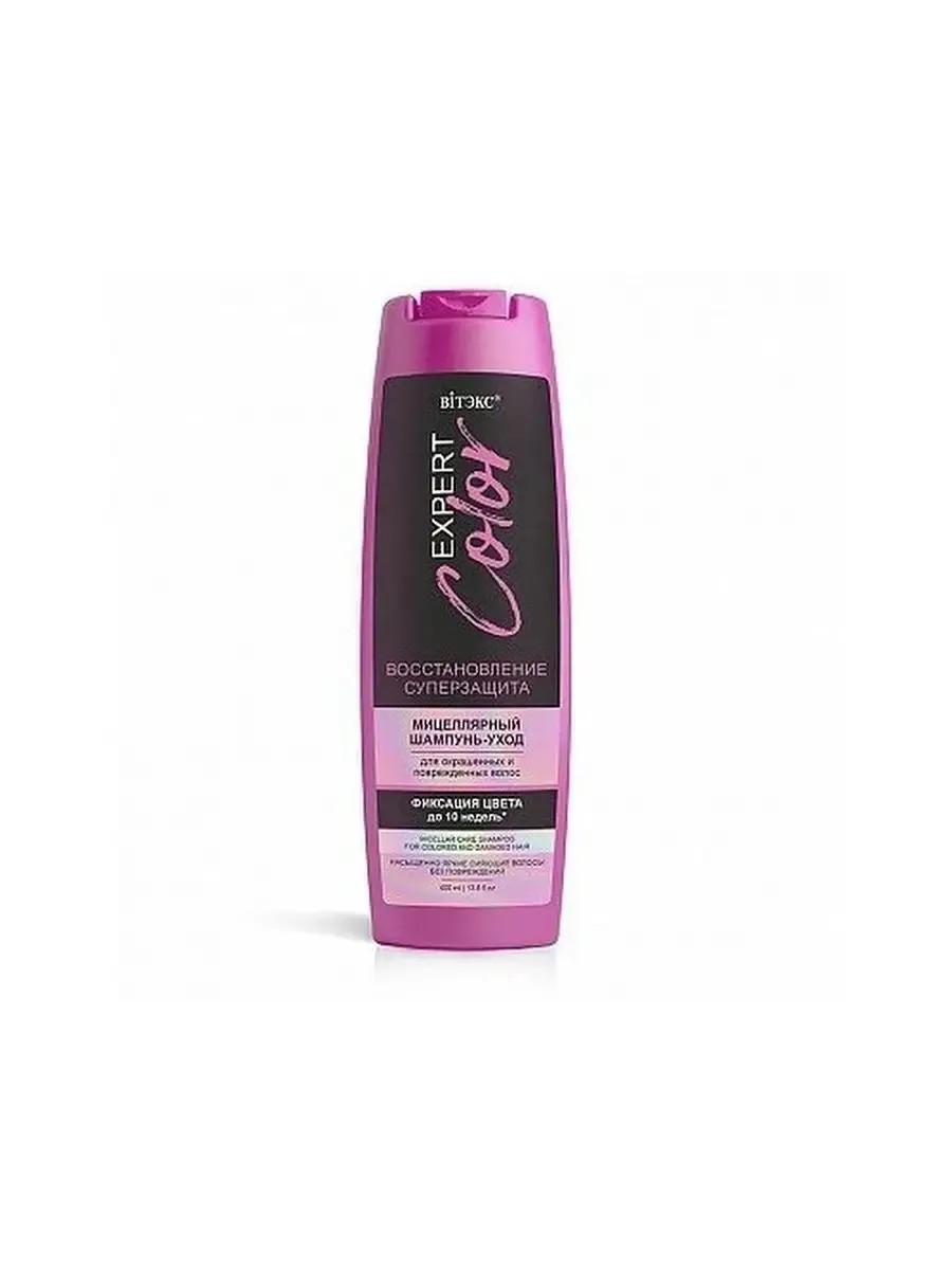 Витэкс, Шампунь-уход для окрашенных и поврежденных волос 400 мл. Шампунь-уход создан по специально разработанной экспертной формуле, чтобы подарить профессиональное восстановление и суперзащиту окрашенным, мелированным, тонированным и поврежденным волосами.Современная мицеллярная технология очень мягко и при этом тщательно очищает волосы и кожу головы, не пересушивая и не вызывая раздражения.Особая восстанавливающая микроэмульсия содержит инновационный стабилизатор цвета, который препятствует вымыванию пигмента из структуры волосяного стержня, оживляет и фиксирует оттенок волос, позволяет сохранить насыщенность цвета до 10 недель.Активные восстанавливающие молекулы проникают в глубину волос, ремонтируя повреждения от корней до кончиков, придают волосам прочность и сияние.Результат просто Wow! Роскошные, сильные волосы, насыщенные ярким цветом и сиянием, как после посещения салона.Дополнительные свойства: делает волосы более послушными, облегчает расчесывание и укладку.