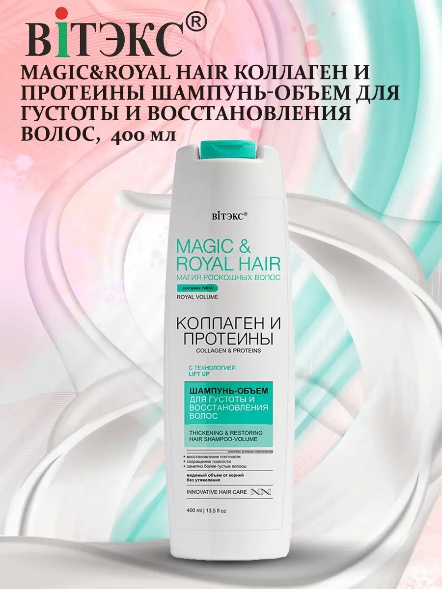 This volumizing shampoo is based on revolutionary technology designed to create truly regal hair volume from the roots—elastic, airy, lush, and incredibly long-lasting. Modern, ultra-gentle ingredients thoroughly and delicately cleanse the hair and scalp of dust, sebum, styling product residue, and other impurities, ensuring long-lasting freshness. Collagen envelops each strand in a weightless veil that adds density and elasticity without weighing down curls, making them visually and to the touch thicker, filling them with maximum volume. Cleansing, volume, nourishment, hydration, hair care, lightness, shine. Hyaluronic collagen. Belarusian cosmetics for oily, dry, split ends, brittle, skin growth, shower, violet, yellowness, pure blondes, sulfates, restoration, curly, therapeutic, cleansing, cosmetics, natural, damaged, daily. [This sentence appears to be a mistranslation.]