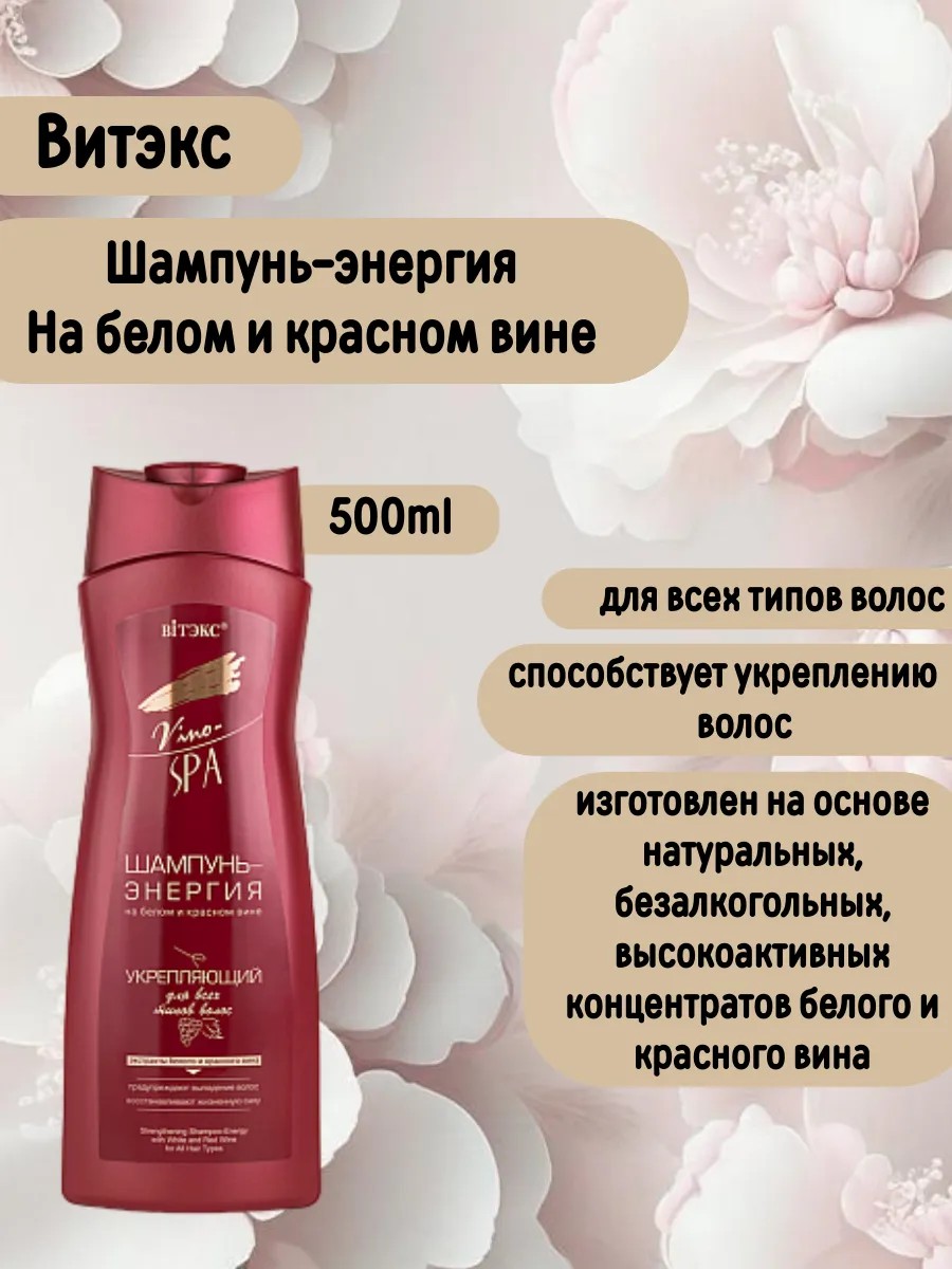 Шампунь-энергия на белом и красном вине укрепляющий для всех типов волос Витэкс. Активные компоненты: Optivegetol Wine — экстракт красного вина — способствует укреплению волос.