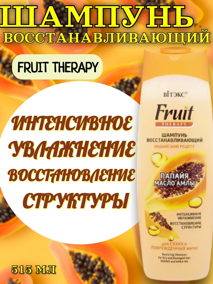 Шампунь восстанавливающая Витэкс Fruit Therapy для сухих и поврежденных волос 515мл.- Интенсивная формула шампуня, вдохновленная традиционными индийскими рецептами, сочетает восстанавливающую силу индийских фруктов и очень мягкое, аккуратное очищение волос и кожи головы. Свежайший сок спелой папайи, ценное масло амлы и эффективные ухаживающие комплексы обеспечивают волосам необходимое увлажнение и питание, заполняют микроповреждения, восстанавливают структуру и приглаживают кутикулу волос. Волосы становятся шелковистыми и послушными, приобретают красивое сияние.