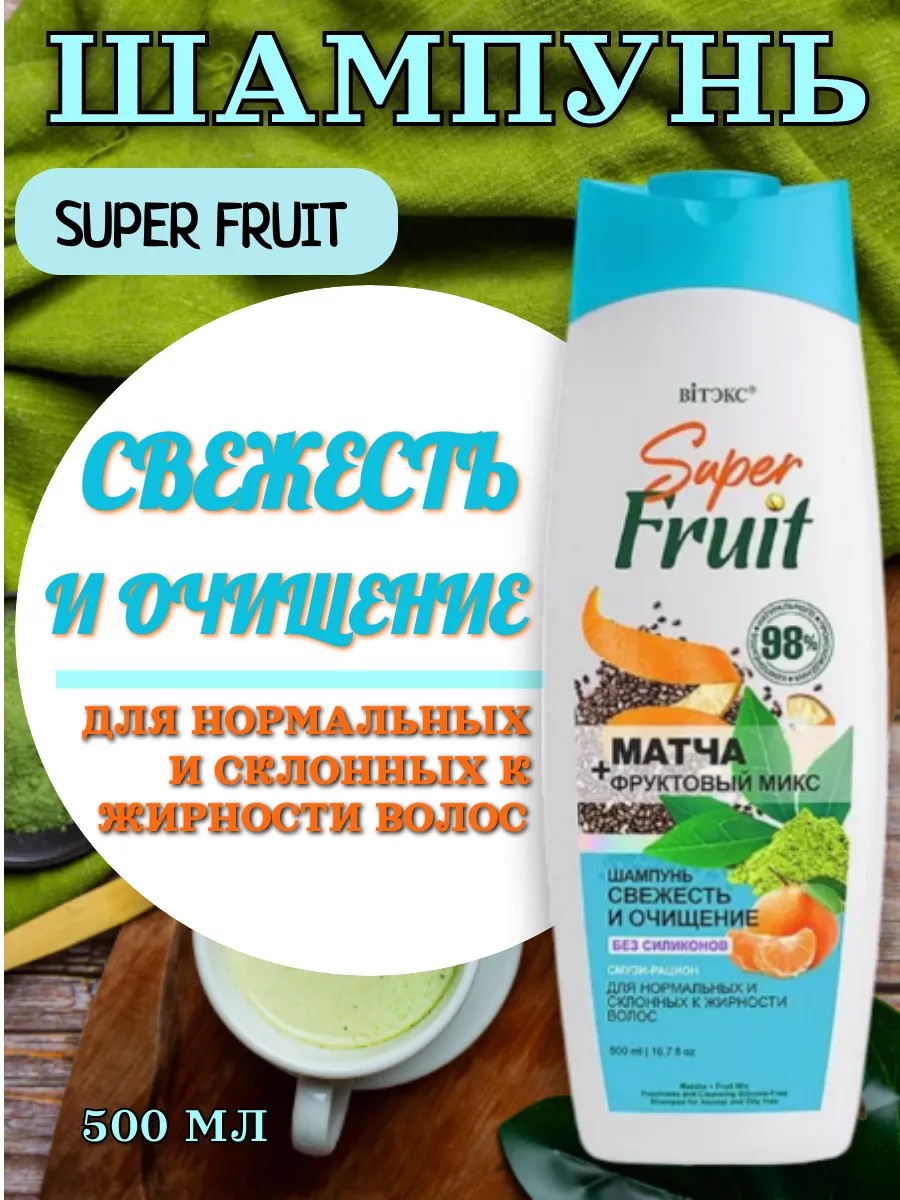 Шампунь Витэкс Super Fruit Матча+фруктовый микс для нормальных и склонных к жирности волос 500 мл. - разработанный экспертами ВИТЭКС по уникальной рецептуре без силиконов, красителей и парабенов, наполнен экстрактами 100% природного происхождения. Густая кремовая пена глубоко, «до скрипа» очищает волосы и кожу головы от загрязнений и остатков стайлинговых средств без раздражения и пересушивания. Насыщенная формула – это очень вкусный и полезный смузи-рацион с чаем матча и фруктовым миксом из чиа, золотого апельсина, арбуза, зизифуса, кале, моринги, сезама, индийского граната и цитруса сацума, который оздоравливает волосы, помогает нормализовать себорегуляцию, дарит волосам свежесть и приятный аромат, позволяет им дольше оставаться чистыми.