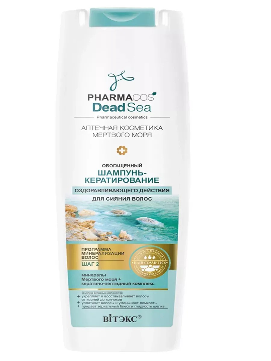 Vitex, PHARMACos DEAD SEA Keratin Shampoo, Enriched with a healing effect for shiny hair, 400 ml, 1 pc. Keratin shampoo is an innovative product that provides comprehensive cleansing, healing, and restorative care for hair. The keratin-peptide complex fills voids and micro-irregularities in the hair structure, restores, thickens, and smoothes hair along the entire length. The hair surface becomes mirror-smooth, and curls acquire a radiant shine. 20 healing minerals from the Dead Sea nourish and heal hair, filling it with vitality from root to tip, reducing breakage, and adding elasticity and flexibility.