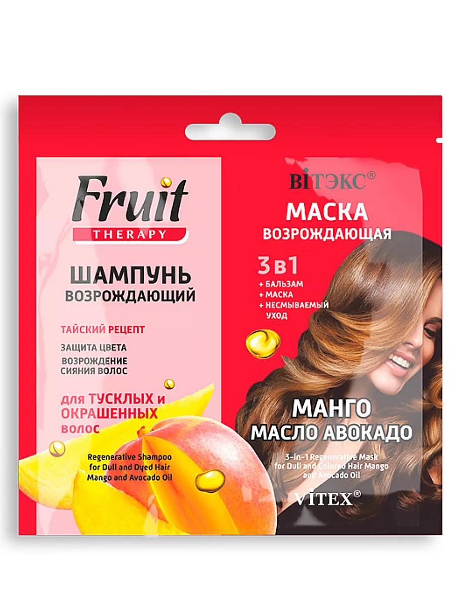 Reviving Shampoo 10 ml + Revitalizing Mask 3-in-1 10 ml FRUIT Therapy MANGO AND AVOCADO OIL. For dull and color-treated hair. COLOR PROTECTION and REVITALIZATION OF HAIR RADIANCE. The unique formulas of the shampoo and mask are developed based on traditional Thai recipes specifically for dull and color-treated hair and give it the reviving power of Thai fruits. The freshest juice of ripe mango, valuable avocado oil and effective care complexes nourish, moisturize and restore hair along the entire length, restoring its shine and beauty, making hair soft, smooth and silky, protecting from the negative impact of external factors, helping to maintain the vibrancy of color for up to 10 weeks.* (*Equivalent to 20 uses on average.) REVITALIZING SHAMPOO. This shampoo provides excellent cleansing, allowing the line's active ingredients to penetrate deep into the hair structure, restoring shine and radiance while maintaining the colorfastness of dyed hair. For faster and more noticeable results, use the line's 3-in-1 mask after shampooing.