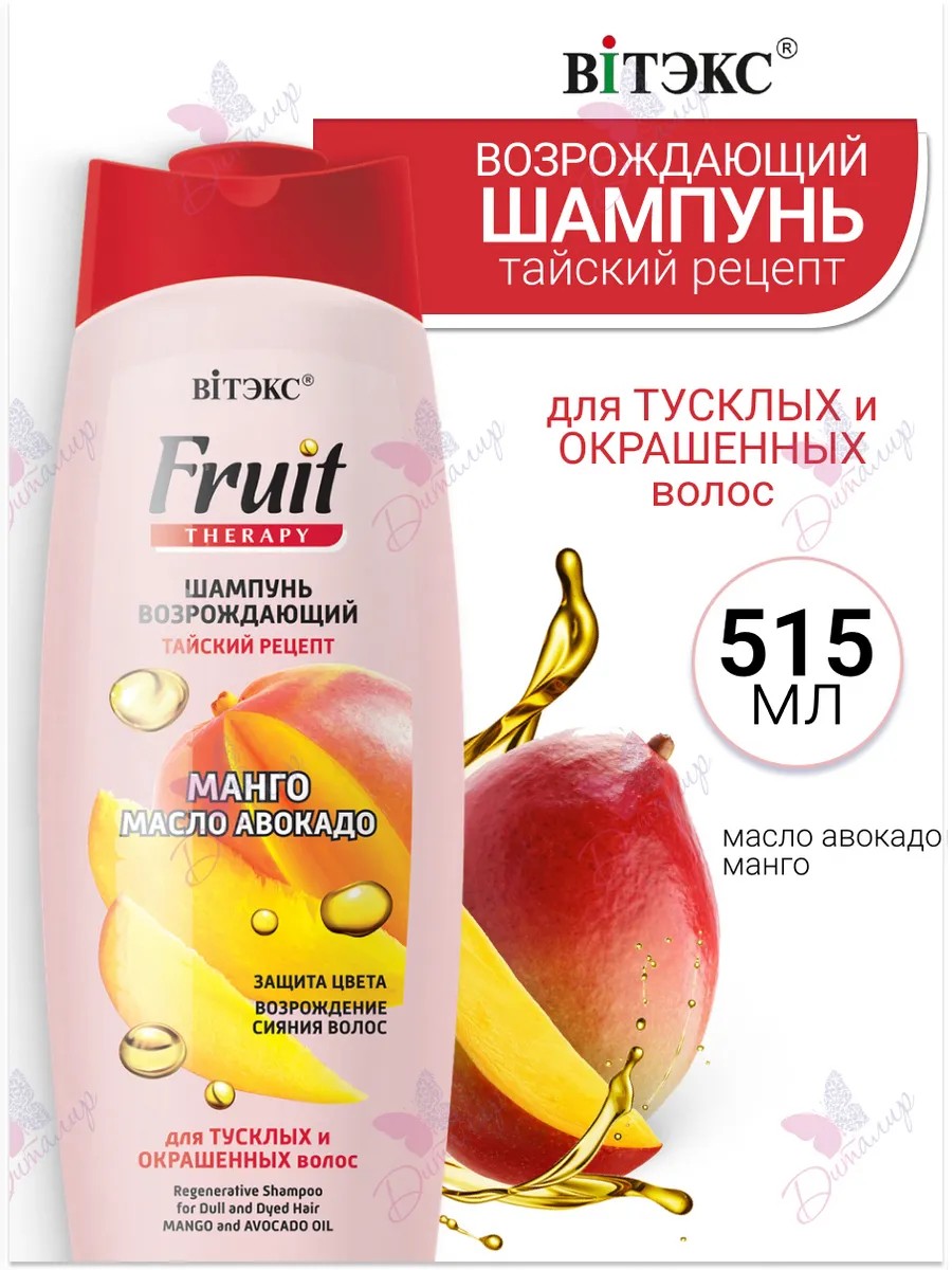 Шампунь возрождающий для тусклых и окрашенных волос манго, масло авокадо. Характеристики тайский рецепт. Защита цвета. Возрождение сияния волос. Уникальная формула шампуня разработана на основе традиционного тайского рецепта специально для тусклых и окрашенных волос и дарит им возрождающую силу тайских фруктов в сочетании с превосходным очищением. Свежайший сок спелого манго, ценное масло авокадо и эффективные ухаживающие комплексы питают, увлажняют и восстанавливают волосы по всей длине, возрождая их сияние и красоту, придают волосам мягкость, гладкость и шелковистость, защищают от негативного воздействия внешних факторов, помогают сохранить яркость цвета до 10 недель.*блистательный результат: роскошный яркий цвет здоровых блестящих волос. *в среднем эквивалентно 20 применениям.