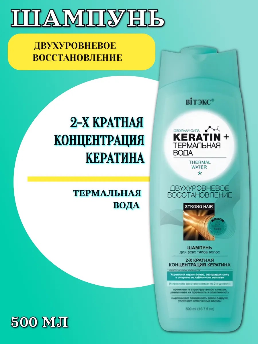 Vitex Keratin & Thermal Water Two-Level Repair Shampoo 500 ml - this shampoo gently cleanses, nourishes, and strengthens hair, helping to restore and renew its structure at the cellular level. It combats 7 signs of hair aging: porosity, dullness, brittleness, thinning, split ends, and dryness.