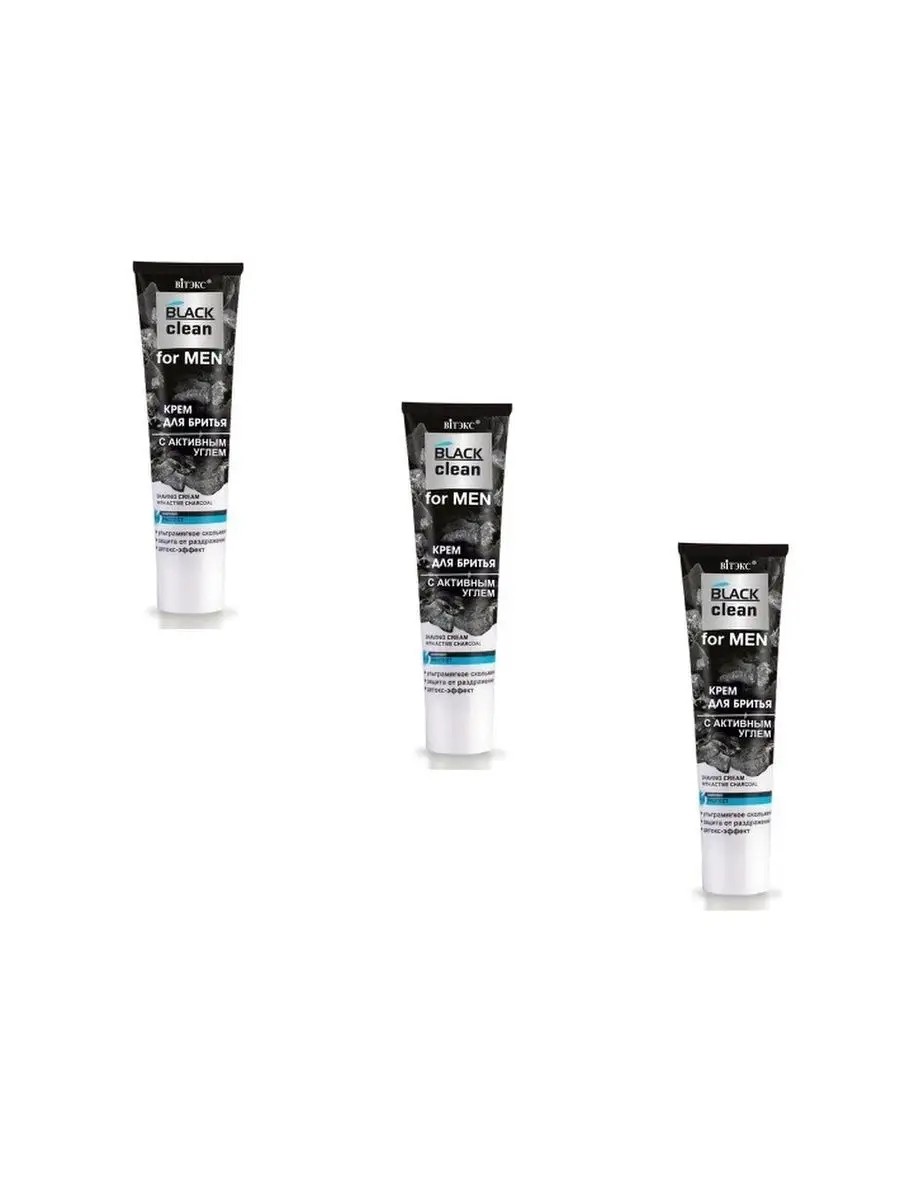 VITEX BLACK CLEAN FOR MEN SHAVING CREAM with activated charcoal, 100 ml, 3 pcs., The special formula of the cream is developed taking into account the characteristics of men's skin. A cascade of effective components (active black charcoal, GlideProtect complex, natural aloe vera gel) simultaneously works in 3 directions for a comfortable shave: 1. perfectly softens even the toughest stubble, provides an ultra-soft glide; 2. forms a special protective layer on the skin that protects the skin from cuts, irritation and overdrying; 3. has a detox effect, soothes the skin, prevents inflammation and redness. Result: a quick, comfortable shave and smooth, soft, moisturized skin.