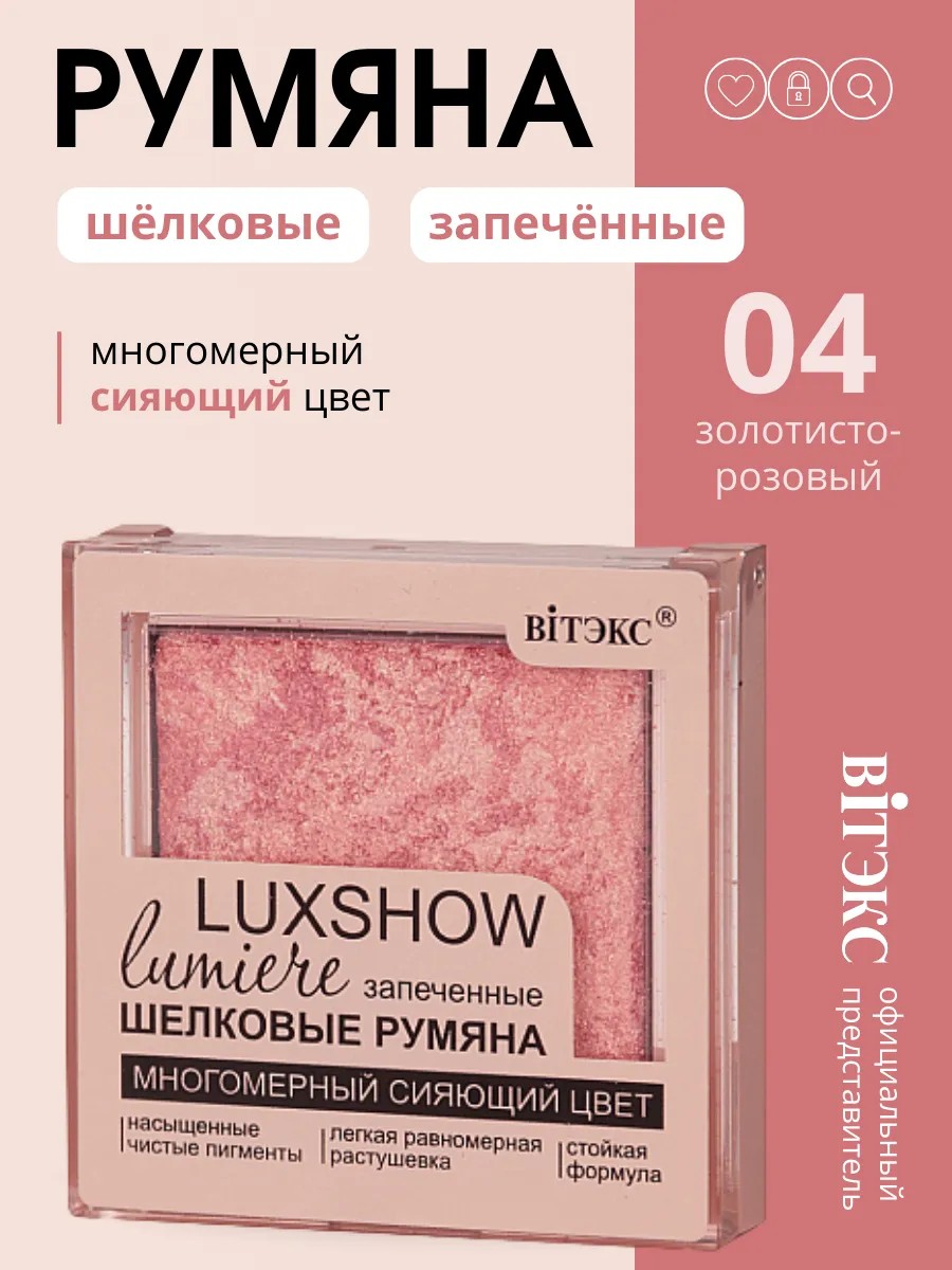 Роскошные сияющие запеченные шелковые румяна LUXSHOW премиального качества от белорусской косметики Витэкс. Оттенки подойдут и блондинкам, и брюнеткам, и рыжеволосым, а также красиво подчеркнут загорелую кожу.