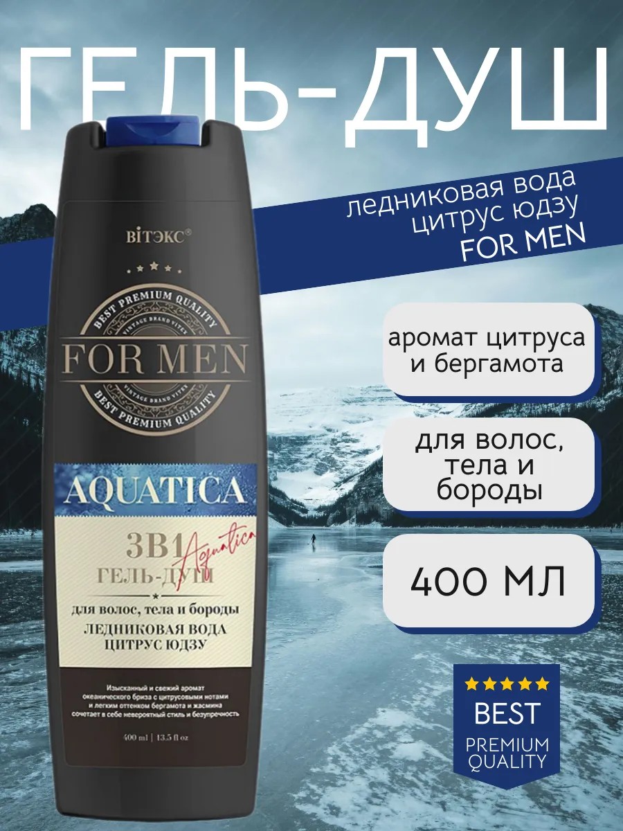 Витэкс FOR MEN Aquatica 3 в 1 Гель для мытья волос, тела и бороды Ледниковая вода и Цитрус Юдзу, 400 мл. Гель для душа 3в1 идеально подходит мужчинам с характером, которые знают толк в хороших ароматах, он подчеркивает уверенность и энергичность, передает настроение азарта, элегантности и легкого флирта. Богатый состав активных компонентов обеспечивает сбалансированный уход за кожей и волосами: Инновационный компонент HYDROVANCE дарит коже превосходное увлажнение, улучшает ее эластичность. Флорапон франжипани питает и укрепляет кожу и волосы, тонизирует, снимает раздражение, ускоряет процессы регенерации. Аллантоин увлажняет и восстанавливает, способствует устранению перхоти. Воздушная кремовая пена безупречно очищает кожу и волосы, увлажняет и смягчает, дарит невероятную свежесть и ощущение чистоты, что делает его идеальным как для утреннего бодрящего душа, так для и водных процедур после насыщенного трудового дня и спортивной тренировки. Изысканный аромат, выразительный и свежий, сексуальный и спортивный одновременно, соединяет в себе прозрачность ледниковой воды и яркость цитруса юдзу, раскрывая и подчеркивая все грани твоей неординарности.