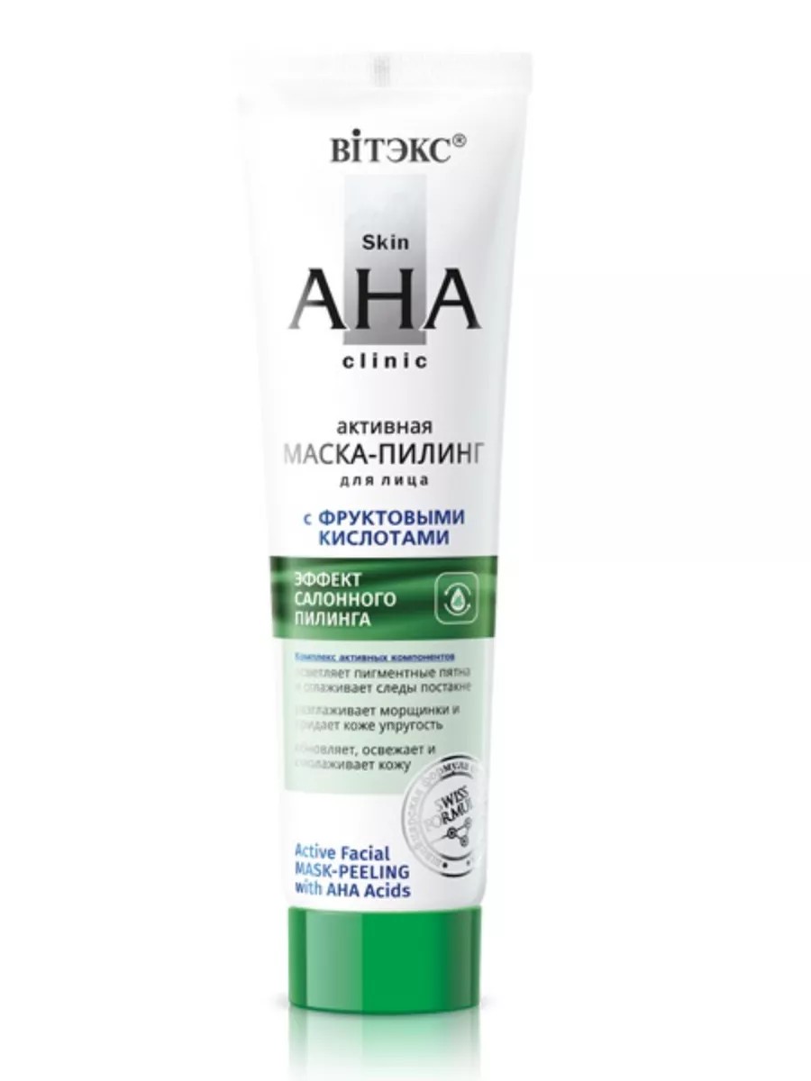 Витэкс Маска-пилинг для лица с фруктовыми кислотами Skin AHA Clinic, 100 мл. Маска-пилинг, созданная по инновационной швейцарской рецептуре, содержит высокоактивные АНА-кислоты и ультрамягкие отшелушивающие энзимы для глубокой и бережной эксфолиации ороговевших клеток и стимулирования обновления и омоложения кожи. Осветляется и выравнивается тон кожи, сглаживаются неровности и морщинки, улучшается выработка собственного коллагена и эластина, повышается упругость и эластичность кожи, замедляются процессы старения. Кожа становится свежей, яркой, ровной и гладкой. Усиливает действие средств последующего ухода. Может использоваться для подготовки кожи к кислотным пилингам. Применение: нанесите тонким слоем на очищенную кожу на 10-15 мин.