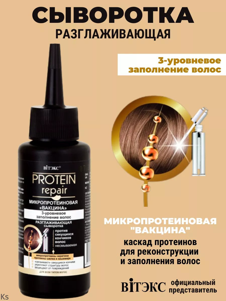 Разглаживающая сыворотка для волос Protein Repair против секущихся кончиков от белорусского бренда косметики Витэкс. Кончики волос наиболее подвержены разрушающему воздействию негативных факторов использование термоприборов, воздействие УФ-лучей и жесткой воды, поэтому им требуется более тщательный уход, чем остальной части волоса. Разглаживающая сыворотка создана для решения проблемы секущихся кончиков, их реставрации и защиты от повреждений. Микропротеиновая "Вакцина" восстанавливает и укрепляет кутикулу волос, запаивает секущиеся кончики. Сыворотка начинает работать на поверхности волос сразу после нанесения и уже через несколько минут можно наблюдать ее волшебную силу: волосы становятся более гладкие, упругие и эластичные, кончики запаиваются.