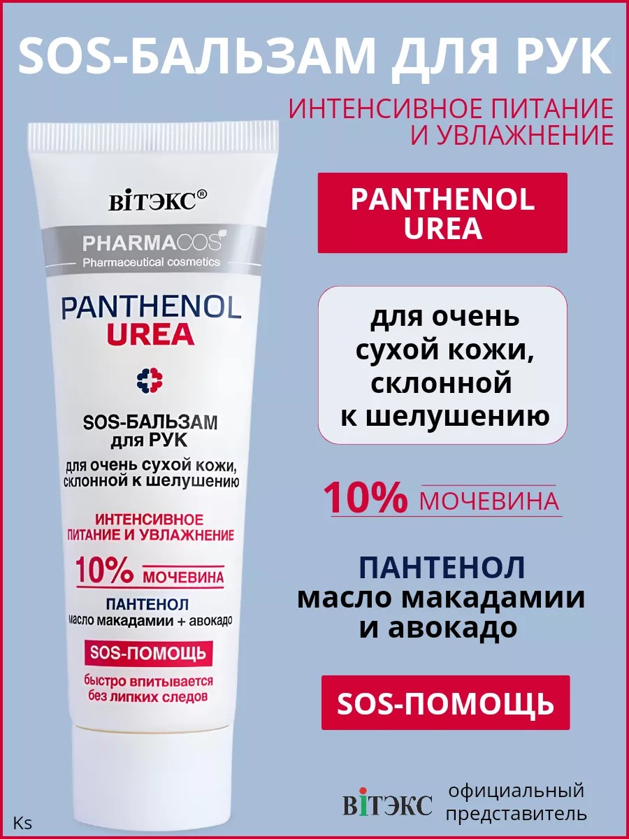 SOS-бальзам для рук для очень сухой кожи, склонной к шелушению интенсивное питание и увлажнение Pharmacos PANTHENOL UREA. Активный бальзам оказывает эффективную SOS-помощь очень сухой, склонной к шелушению коже рук и локтей. Особенно рекомендуется для интенсивного питания, увлажнения, восстановления и защиты сухой и очень сухой кожи.