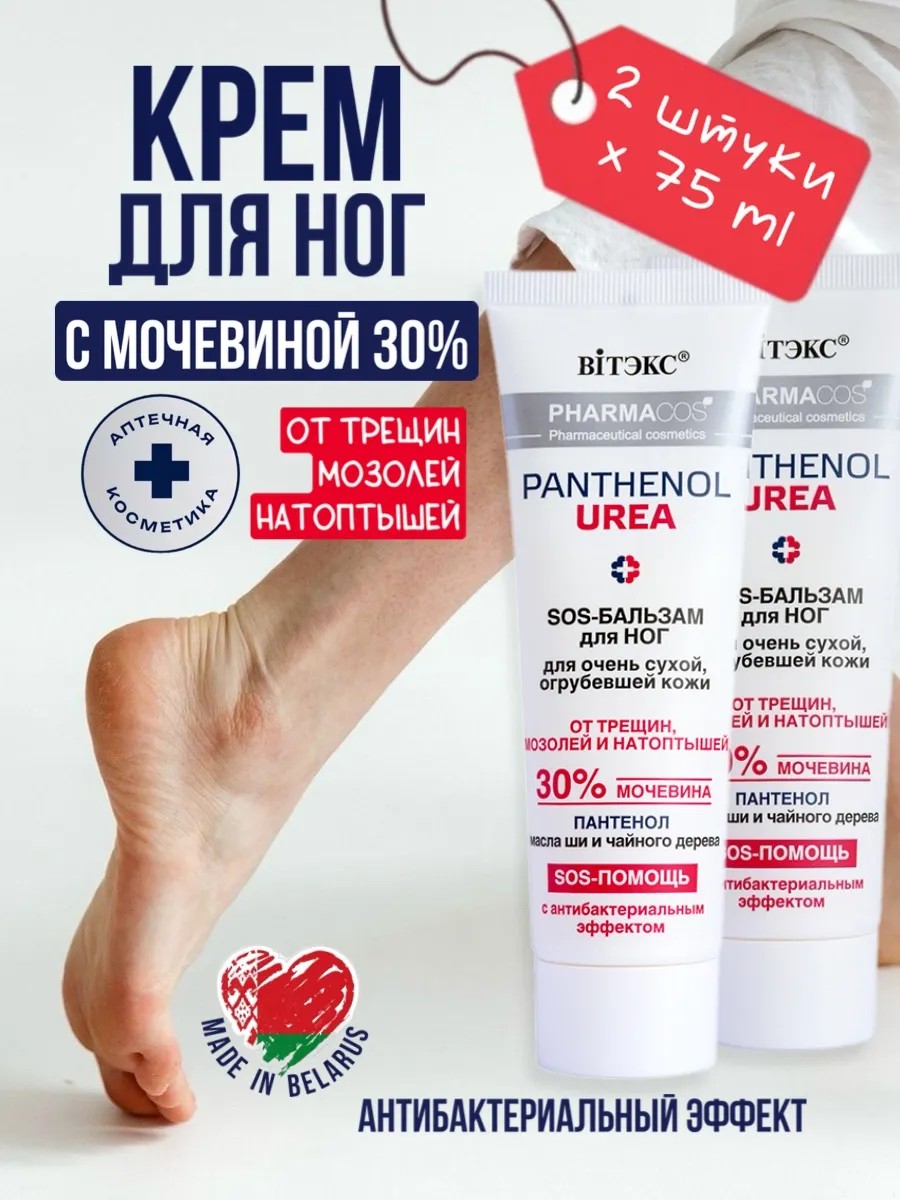 Крем для ног с мочевиной и пантенолом Pantenol Urea бренда Витэкс для очень сухой, огрубевшей кожи от трещин, мозолей и натоптышей с антибактериальным эффектом и мочевиной 30% - 2 шт.*75 мл.