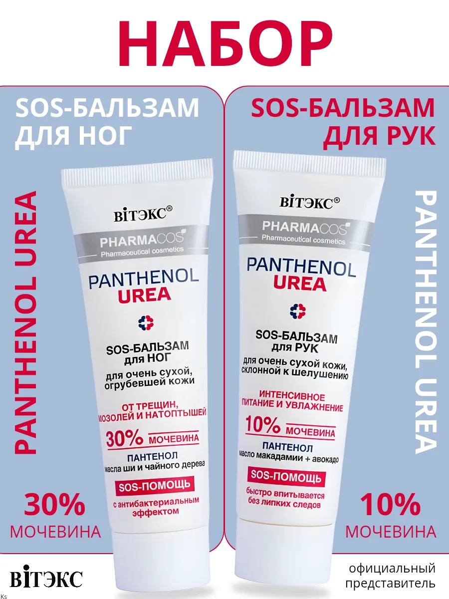 SOS-Бальзам для ног для очень сухой, огрубевшей кожи от трещин, мозолей и натоптышей с антибактериальным эффектом Pharmacos PANTHENOL UREA- 30% мочевина, пантенол, масла ши и чайного дерева. Активный бальзам оказывает эффективную SOS-помощь очень сухой, огрубевшей, склонной к появлению трещин, мозолей и натоптышей коже ног.