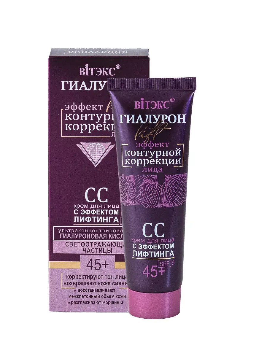 Вiтэкс,Гиалурон ift 45+ СС-Крем для лица с эффектом лифтинга 50мл.СС крем для лица с эффектом лифтинга — многофункциональное средство, которое мгновенно корректирует цвет лица и подтягивает кожу, разглаживая мелкие и глубокие морщины. Активные компоненты: ультраконцентрированная гиалуроновая кислота, светоотражающие частицы, peptide-комплекс Renaissance, солнцезащитный фактор SPF15.