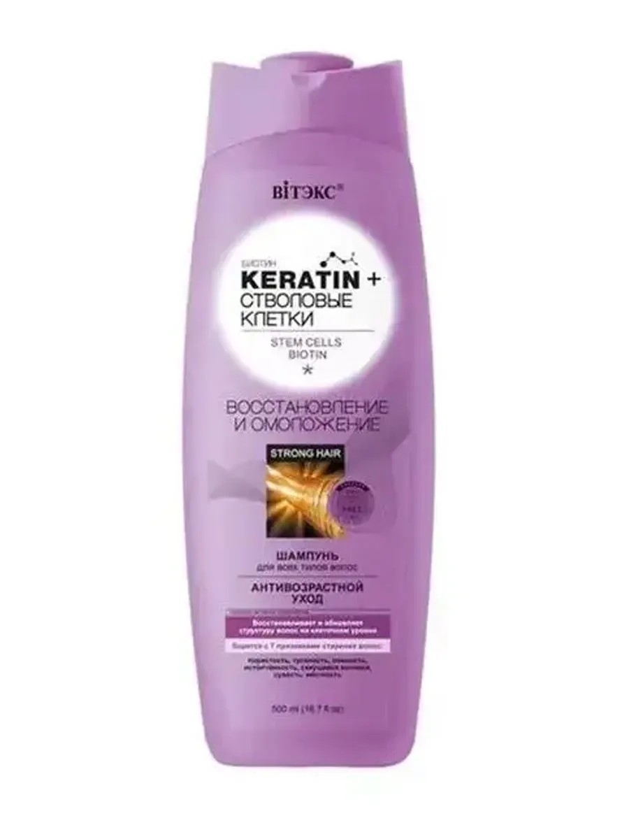 АНТИВОЗРАСТНОЙ УХОД Шампунь нежно очищает, питает и укрепляет волосы, способствуя восстановлению и обновлению их структуры на клеточном уровне. Борется с 7 признаками старения волос: пористость, тусклость, ломкость, истонченность, секущиеся кончики, сухость.Применение: нанесите шампунь на мокрые волосы, вспеньте массирующими движениями, тщательно смойте водой.Для достижения лучшего эффекта используйте вместе с бальзамом «KERATIN + стволовые клетки».